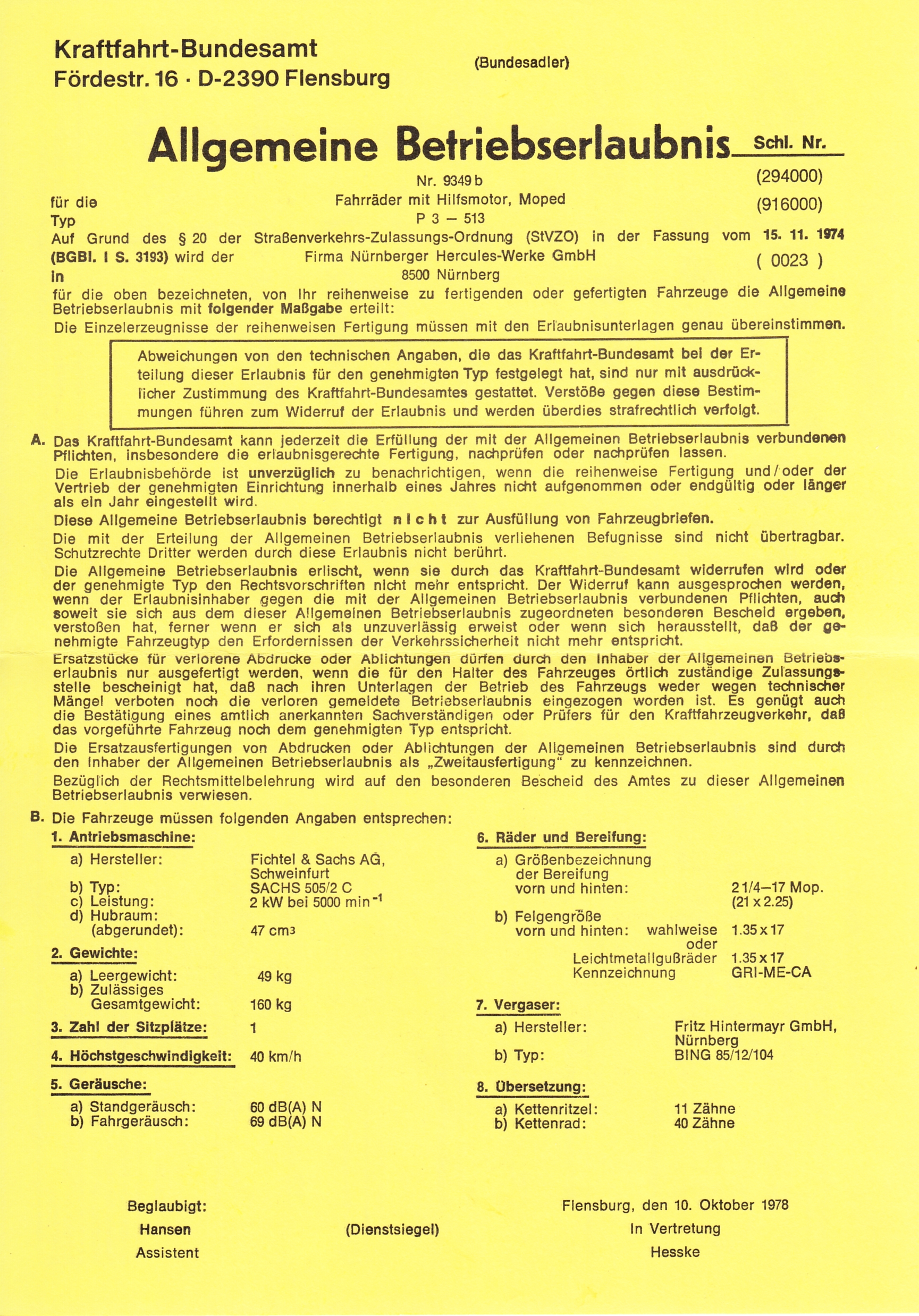 Re: Betriebserlaubnis Hercules Optima 3 oder P3