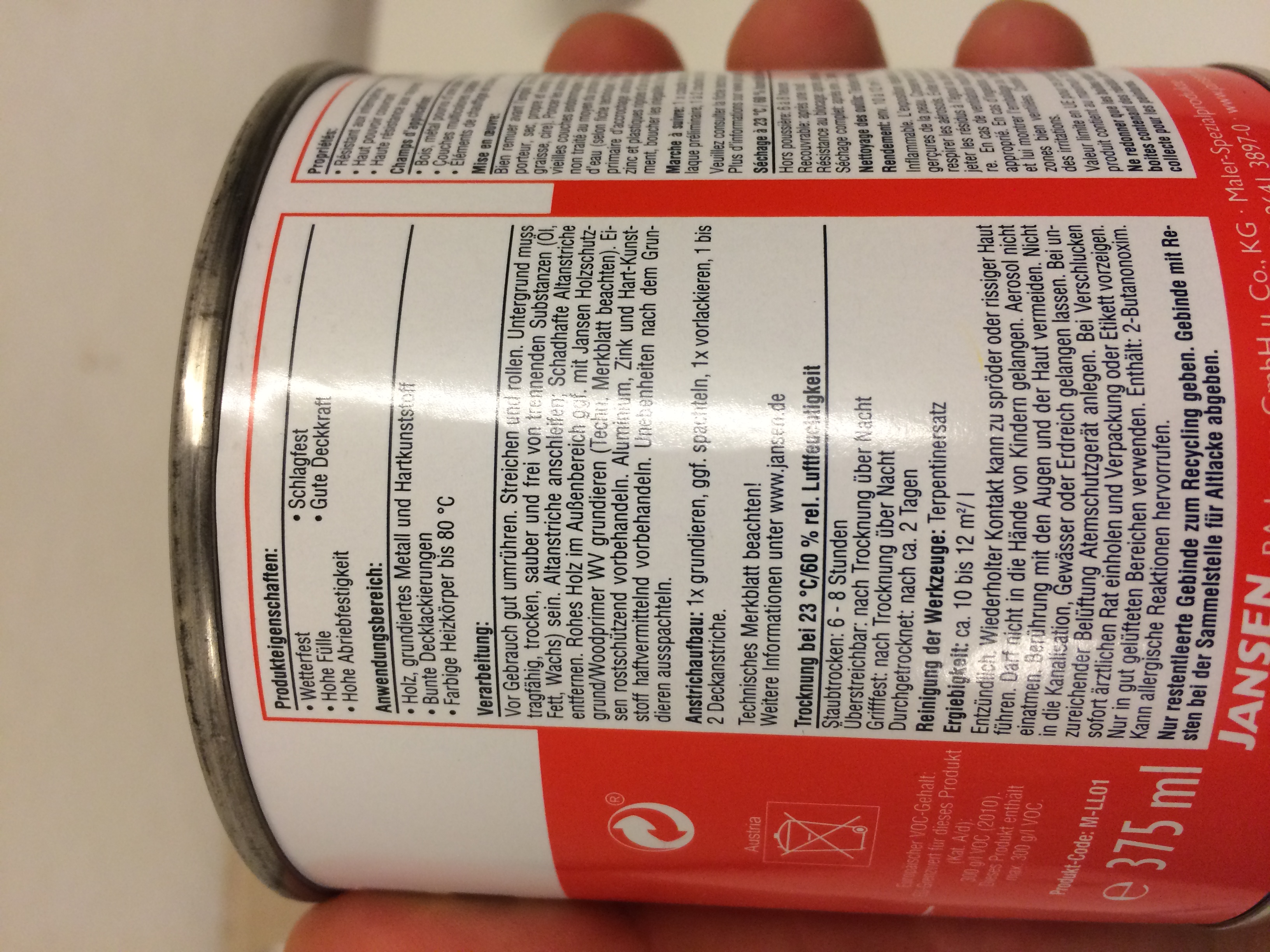 Und klar, das mit dem KFZ-Lack weiß ich jetzt für's nächste Mal besser. Der Verkäufer hat mir halt einfach diesen Lack verkauft, als ich dann draußen war, habe ich auch kurz gestutzt, und mich gefragt, ob das nicht KFZ-Lack sein müsste (Das war dann halt etwas zu spät