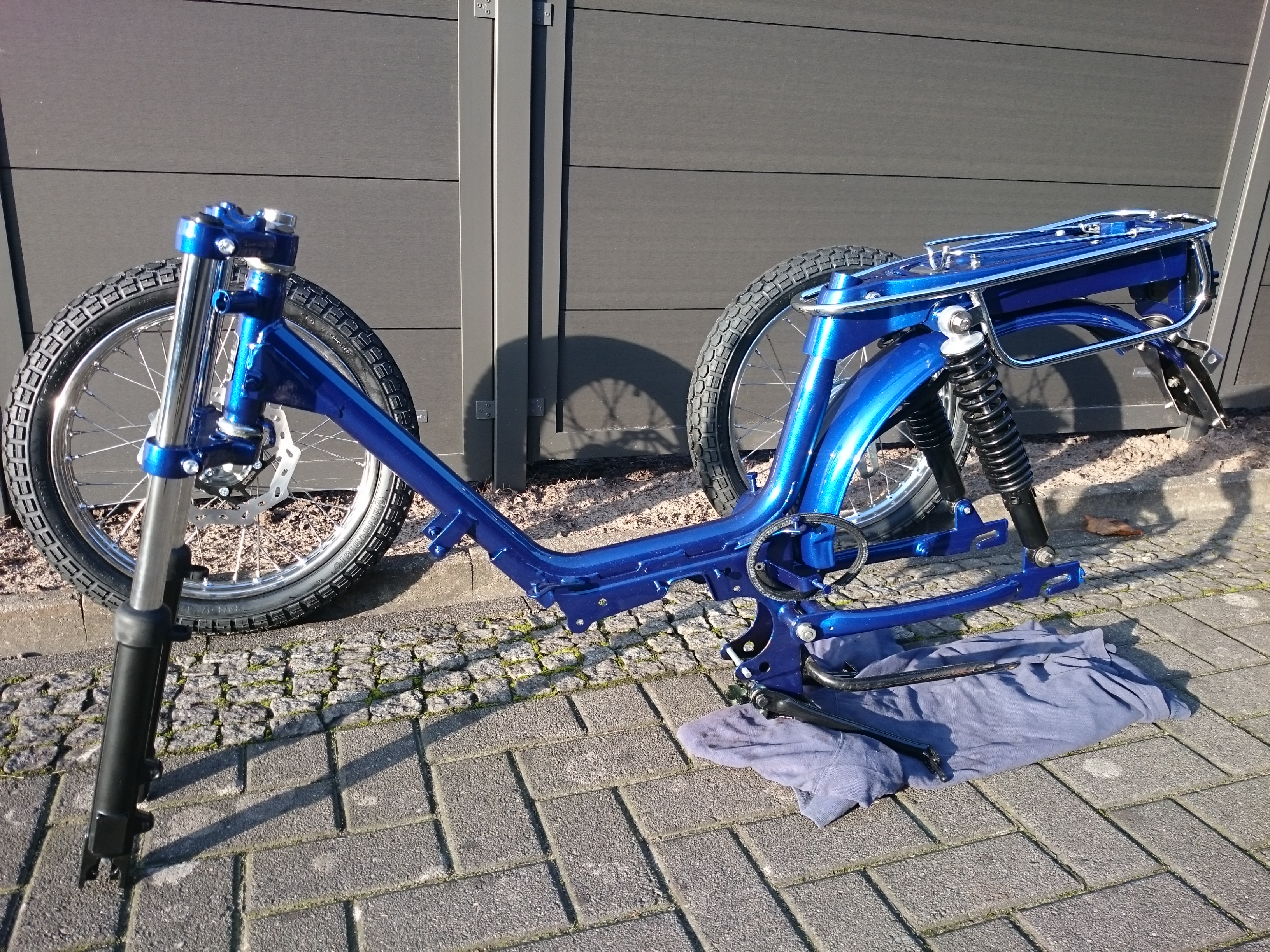 Die Bremsleistung war in den Bergen schon immer ein Problem. Die Trommel wurde so heiß, das sogar das Lagerfett flüssig wurde. Nun gibt eine Scheibenbremse für Puch Maxis. Nach sehr vielen Anpassungen hat es endlich geklappt. Die Bremsleistung ist schon beachtlich. Die EBR Gabel passte auch nicht von Anfang an. Da das ganze mit Speichenrädern aber noch viel schöner aussah, musste wieder umgebaut werden.