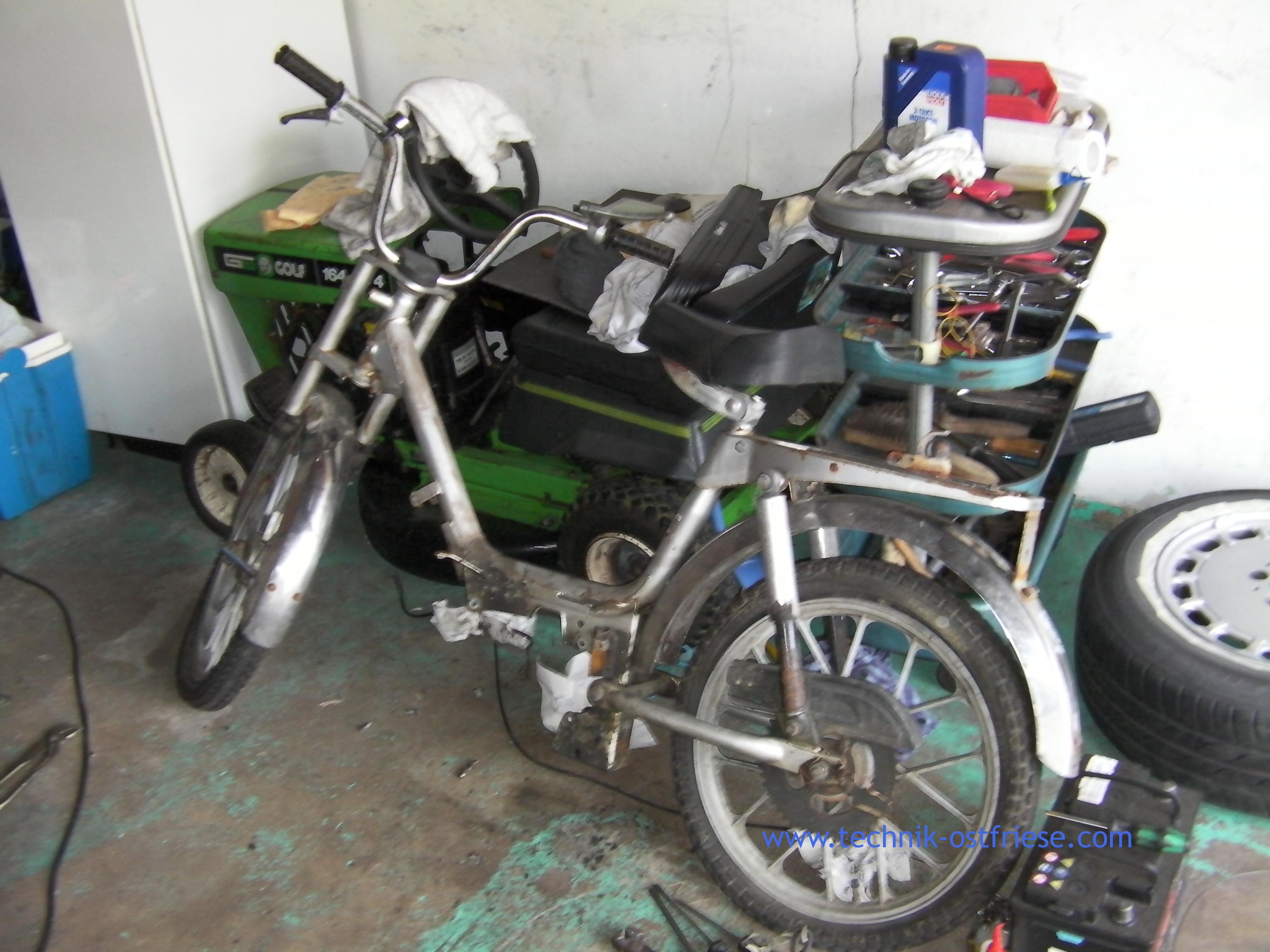 Bei der Abholung am Abend sah das Mofa eigentlich recht passabel aus. Am nächsten Tag konnte man dann jedoch folgende Sachen betrachten, deren Eindruck sich durch das Zerlegen der Komponenten weiter verstärkt hat: