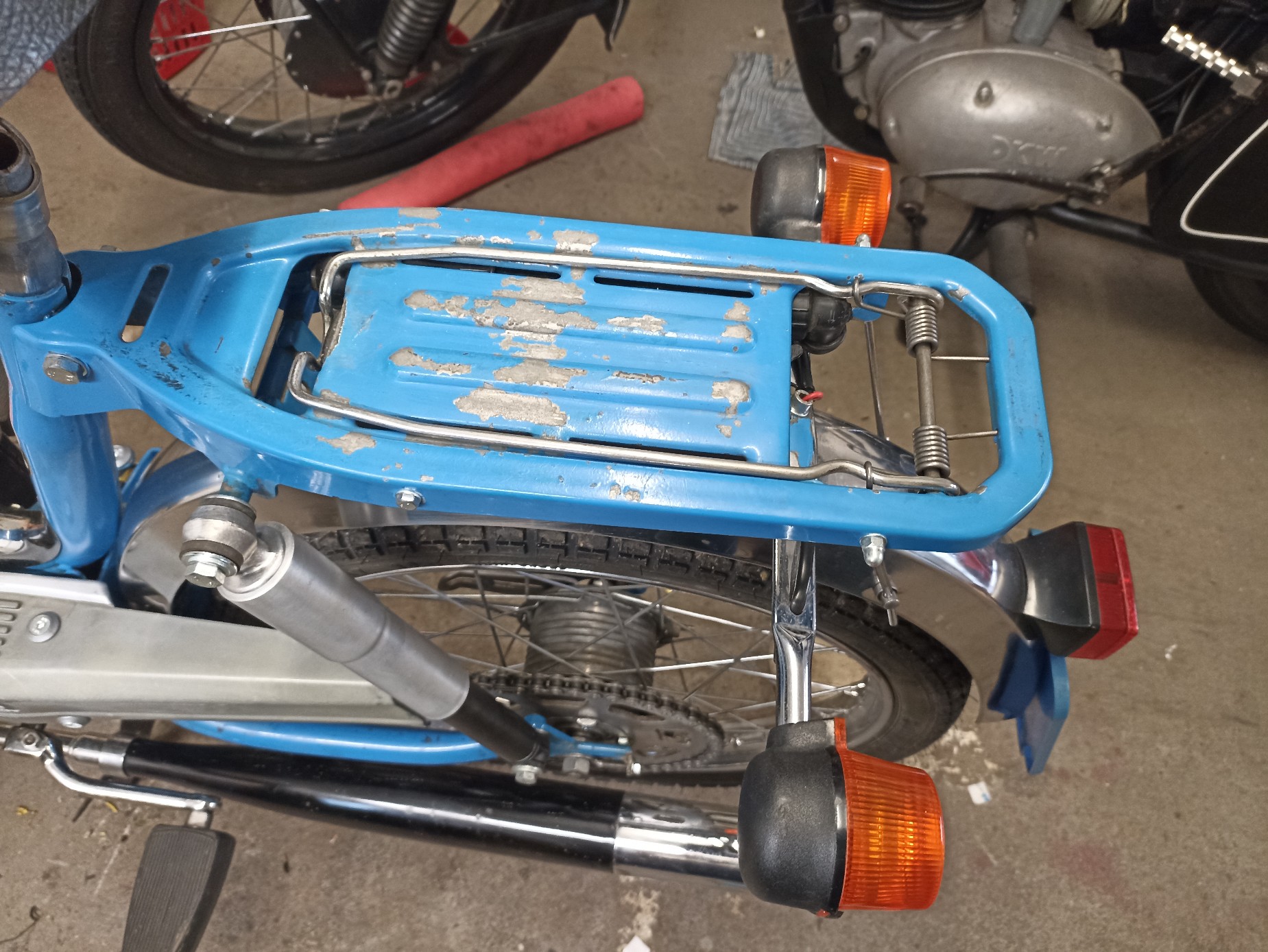 Heute die noch fehlenden Ersatzteile bekommen. Kettenschleifer, Bremsbeläge (sind noch dick, aber bretthart) Ständerfeder, und noch ein paar Kleinigkeiten