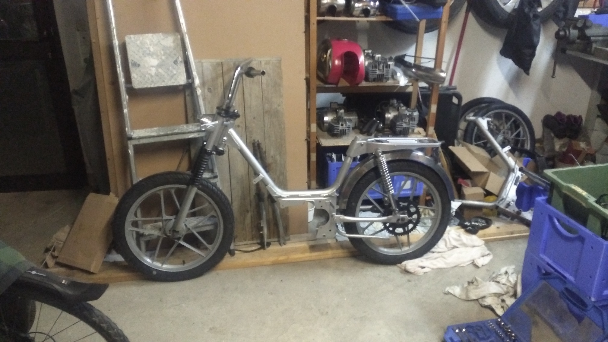 Negativ: bereits begonnene "Restauration" mit jeder Menge abgerissener Gewinde, teilweise schlecht neu lackiert, Verschleißteile wie bspw. Endtopf definitiv nicht mehr zu gebrauchen, dilettantische Schweißversuche am Rahmen, mit einem Wort ziemlich runtergeritten...