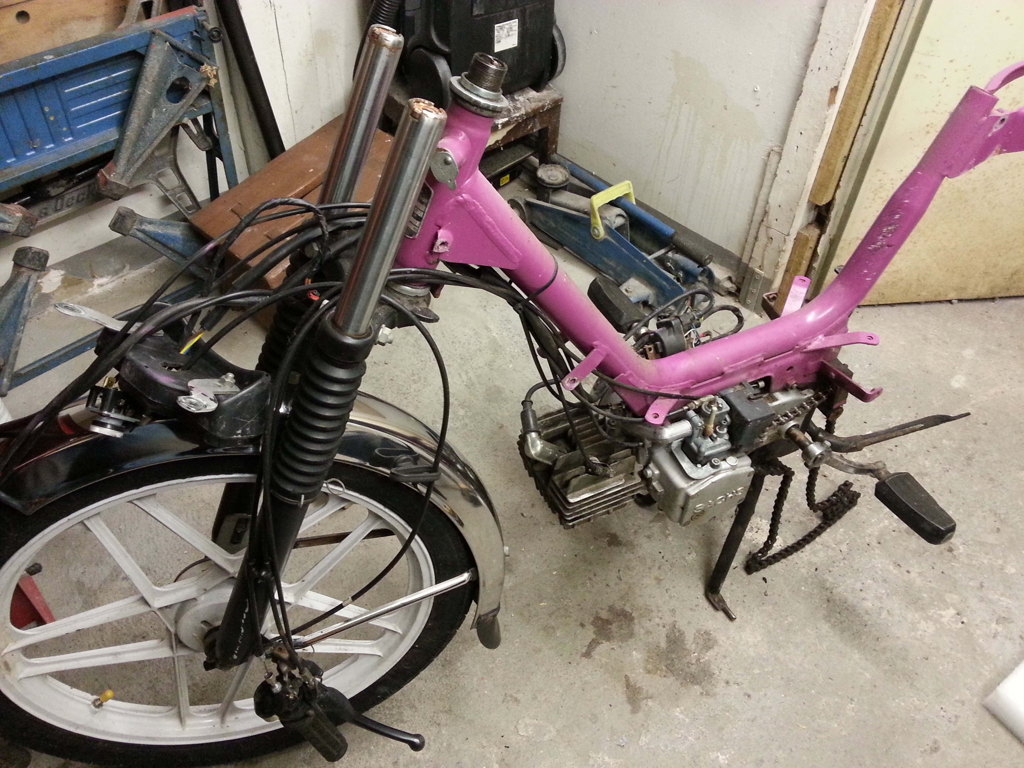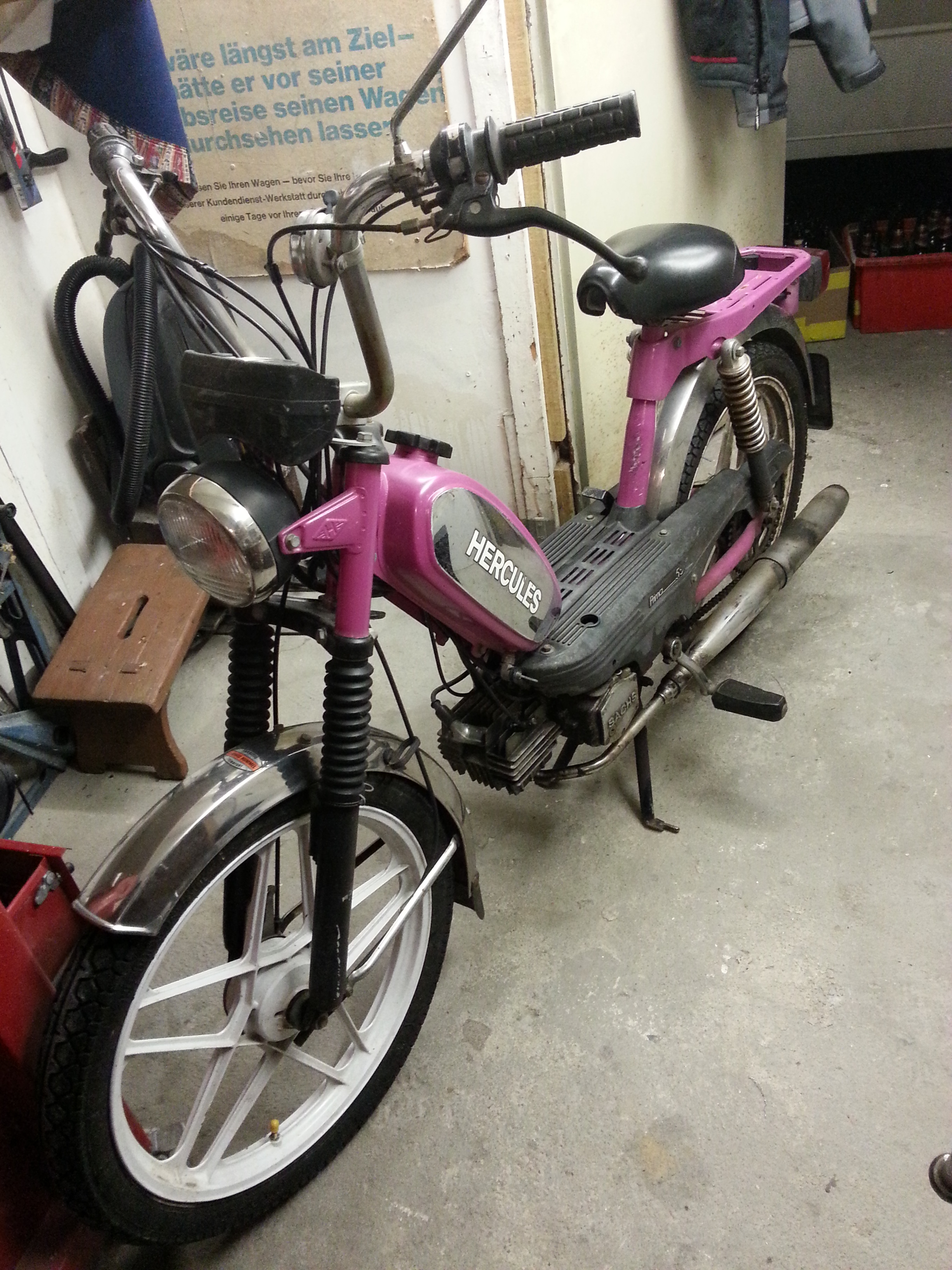 wollte hier mal meine Prima 5s von ´85 vorstellen. Habe sie jetzt schon komplett zerlegt, heute den Motor auch ausgebaut der unberührt bleibt weil er gut aussieht und sogar dicht ist. Kenne das noch von früher das die Dinger immer getropft haben. Werde auf jeden fall mal schauen ob genug Getriebeöl drinne ist. Das schöne Rosa wurde mit Spraydose aufgetragen und lässt sich somit mit Verdünnung abwischen. Drunter ist sie Braunmetallic das aber nicht mehr zu gebrauchen ist weils unterrostet ist. Werde ihr ein Blaumetallic verpassen da mein Bruder schon eine Braune hat. Habe erstmal die ganzen Löscher am Gepäckträger zugeschweißt, war wohl ein Topcase montiert :crazy: . Ansonsten kommt nur ein Originaler Sattel mit Werkzeugfach drauf und der Rest bleibt Original. Ok den Krümmer hab ich Abgesägt :thumbup: