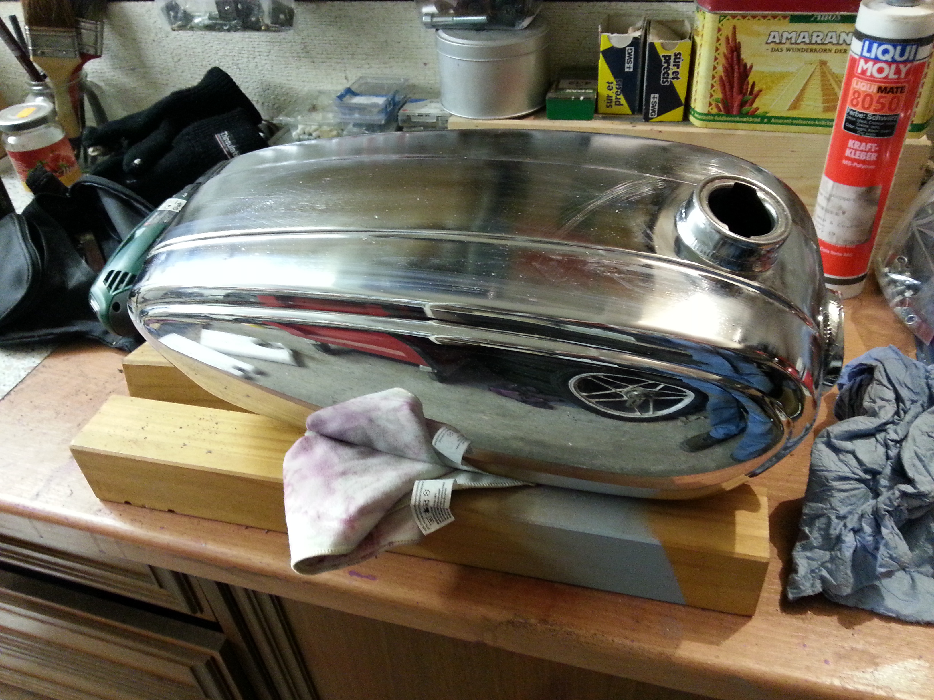 habe gestern den Tank abgebeizt. Hätte nicht gedacht das er noch so gut aussieht. Außerdem habe ich die restlichen Teile gefüllert.