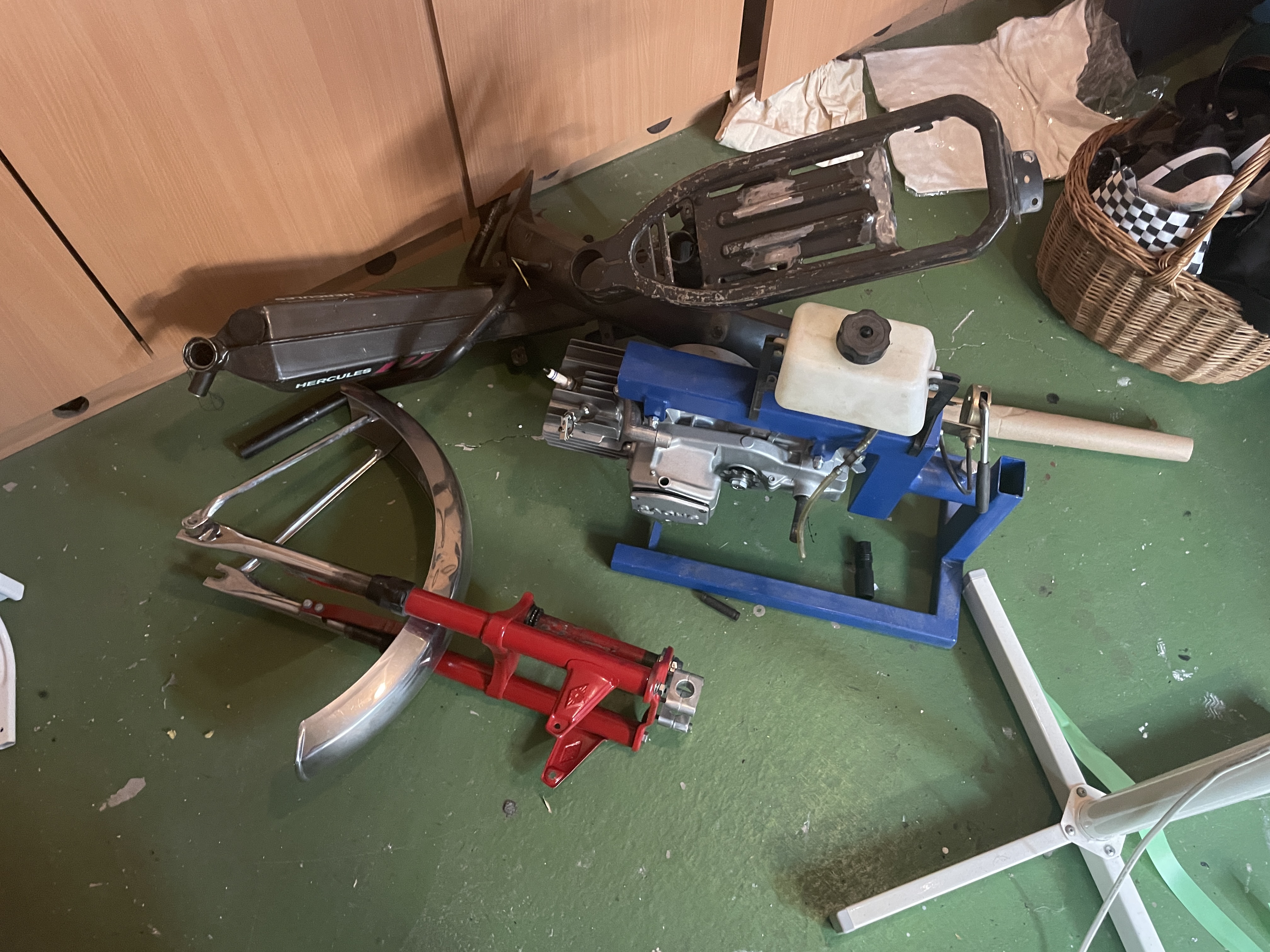 Ich hab dann schließlich einen gefunden der vom Chrom her noch okay war, aber alle Halterungen am Arsch. Ein wenig Hartlöten und ein paar Unterlegscheiben haben den Tank aber wieder einsatzfähig gemacht. Das blöde an der Sache war, dass die Gabel an einem prima 3S Rahmen befestigt war (wo sie nicht drangehört),der nun bei mir im Keller liegt. Zusammen mit ein paar weißen 16 Zoll Rädern, einem noch übrig geblieben Motor und so weiter und so weiter. Kennt jemand von euch einen Therapeuten der mir helfen kann, Mofasammeln ist eine Sucht!