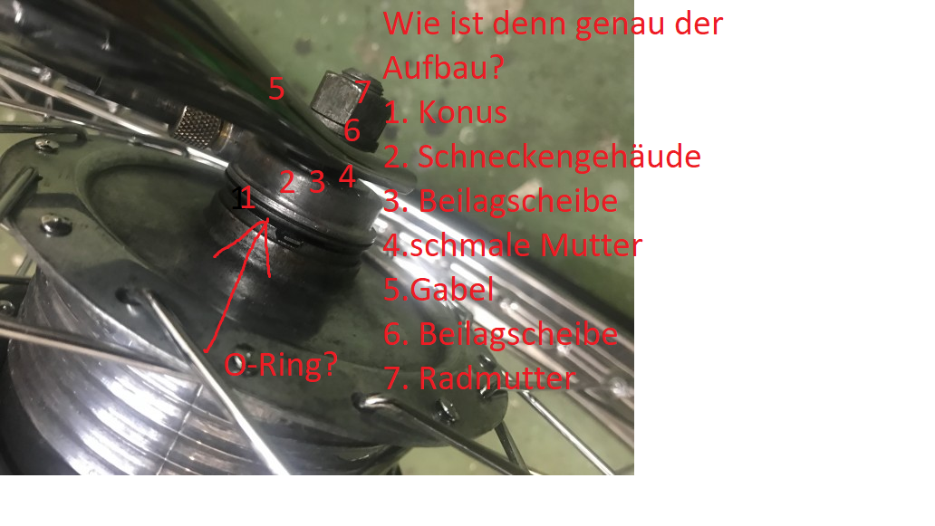 Andere alternative ist die Scheibe dazwischen lassen dafür die dünne Mutter weg und dann die Schnecke mit der dünnen Mutter gegen den Konus kontern. Müsste vom Maß auch passen. Dann kannst du das Radlagerspiel mit dem konus auf der anderen Achsseite einstellen.wedewe hat geschrieben: ↑08.10.2018 11:19