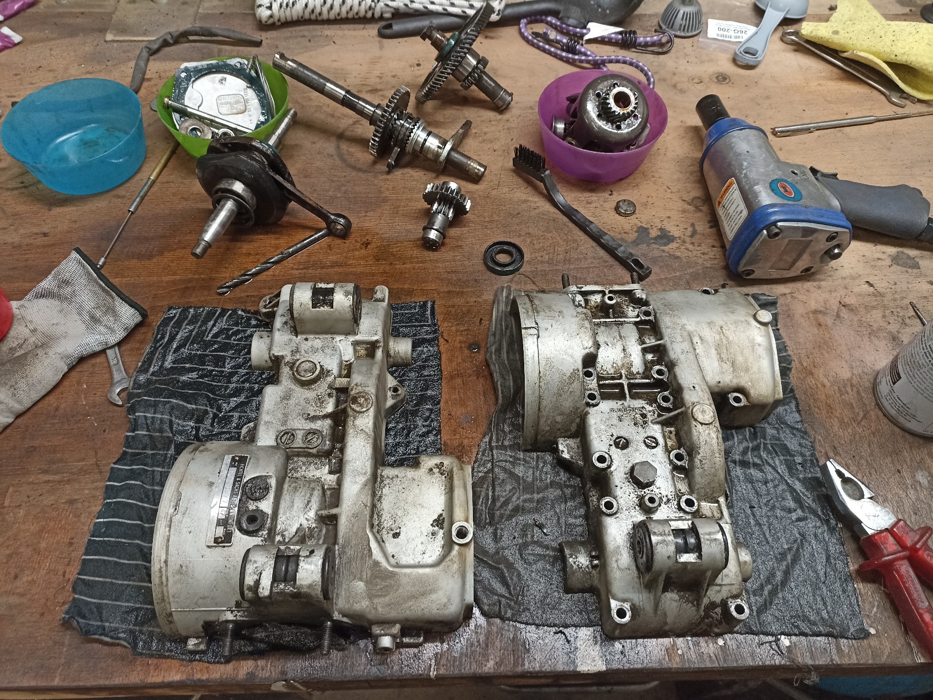 Und eben noch den Motor getrennt. Keine Auffälligkeiten. Wellendichtringe noch minimal weich, das ist der Grund warum ich den lieber auf gemacht habe. Musste nur leider 4 Schrauben ausbohren. War aber kein großer Akt.