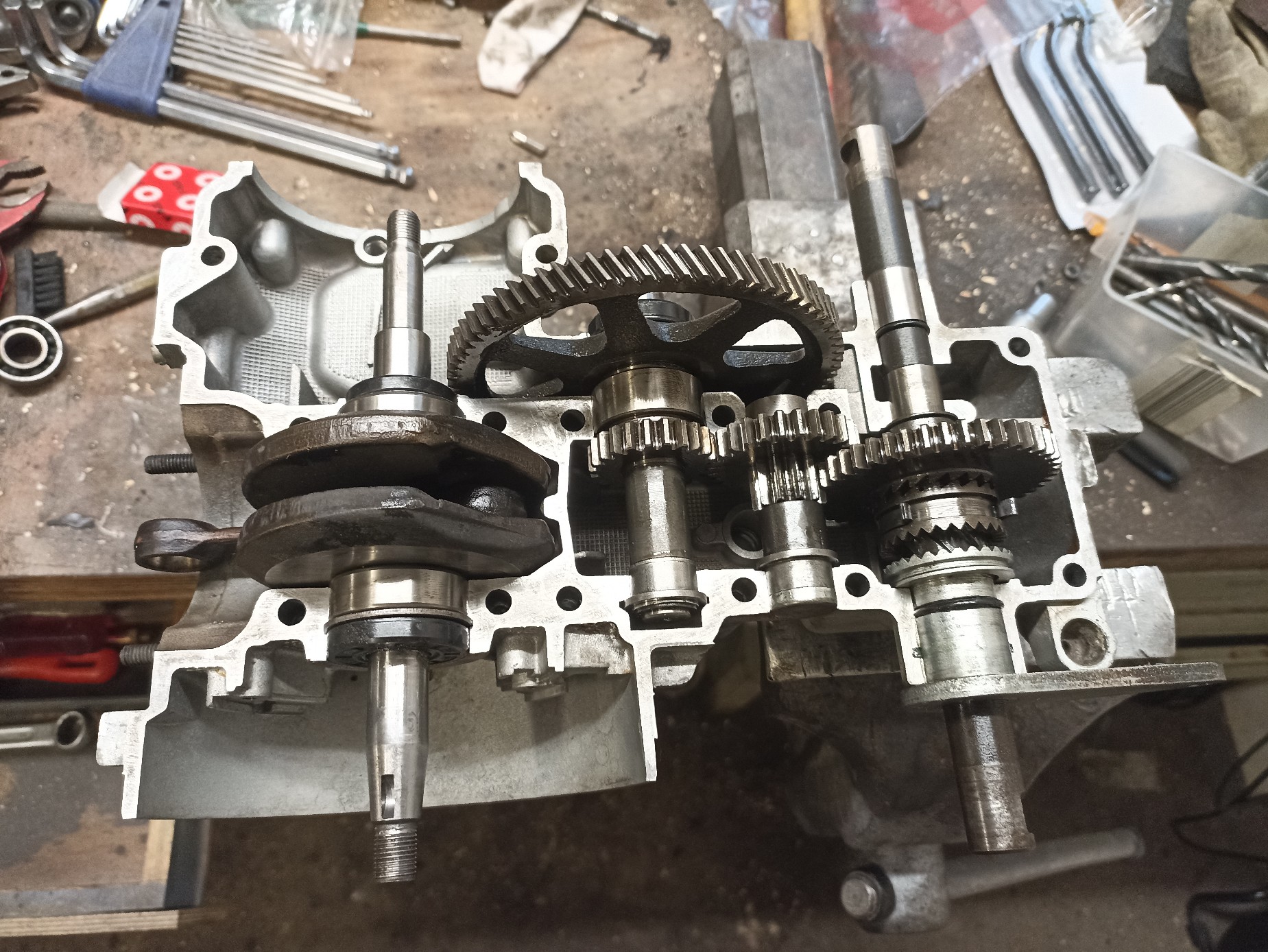Prinzipiell eigentlich kein Problem, ich weiss nur nicht wie man die Kupplungs Buchse von der Kurbelwelle runter bekommen soll. Bei demontierter Welle ziehe ich sie mit den Lagern runter.