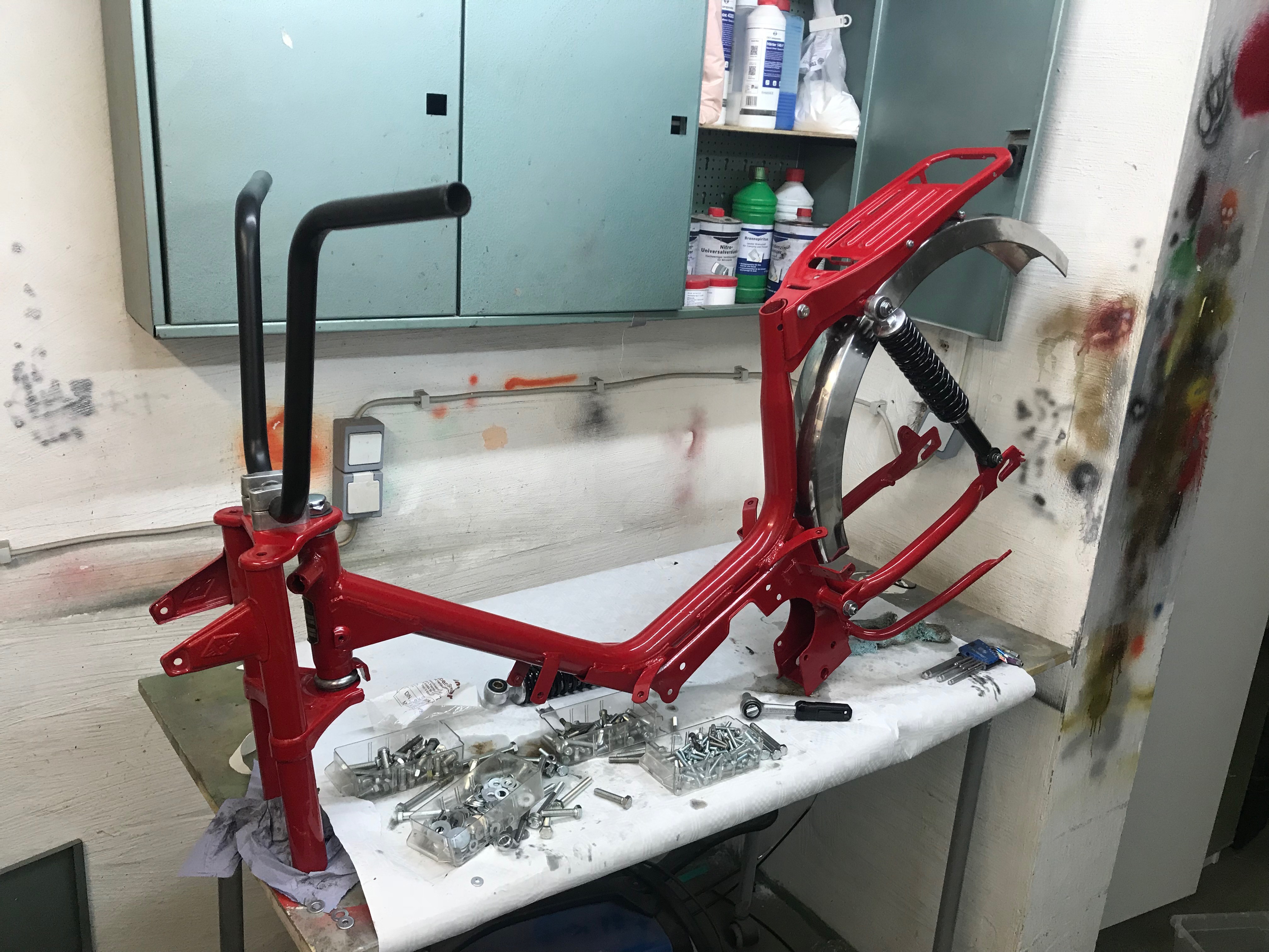 Den alten nicht originalen Sattel der HR2 hab ich auch aufgearbeitet und neu lackiert. Alle Zinkteile waren ja schon vorher mit der HR2 beim Galvanisieren.