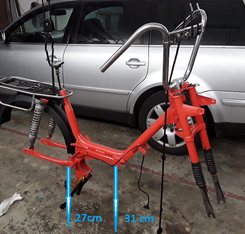 habe ich von Schraube Hinterradschwinge bis zum Boden 27 cm und Motorhalteschraube vorne 31cm bis zum Boden.