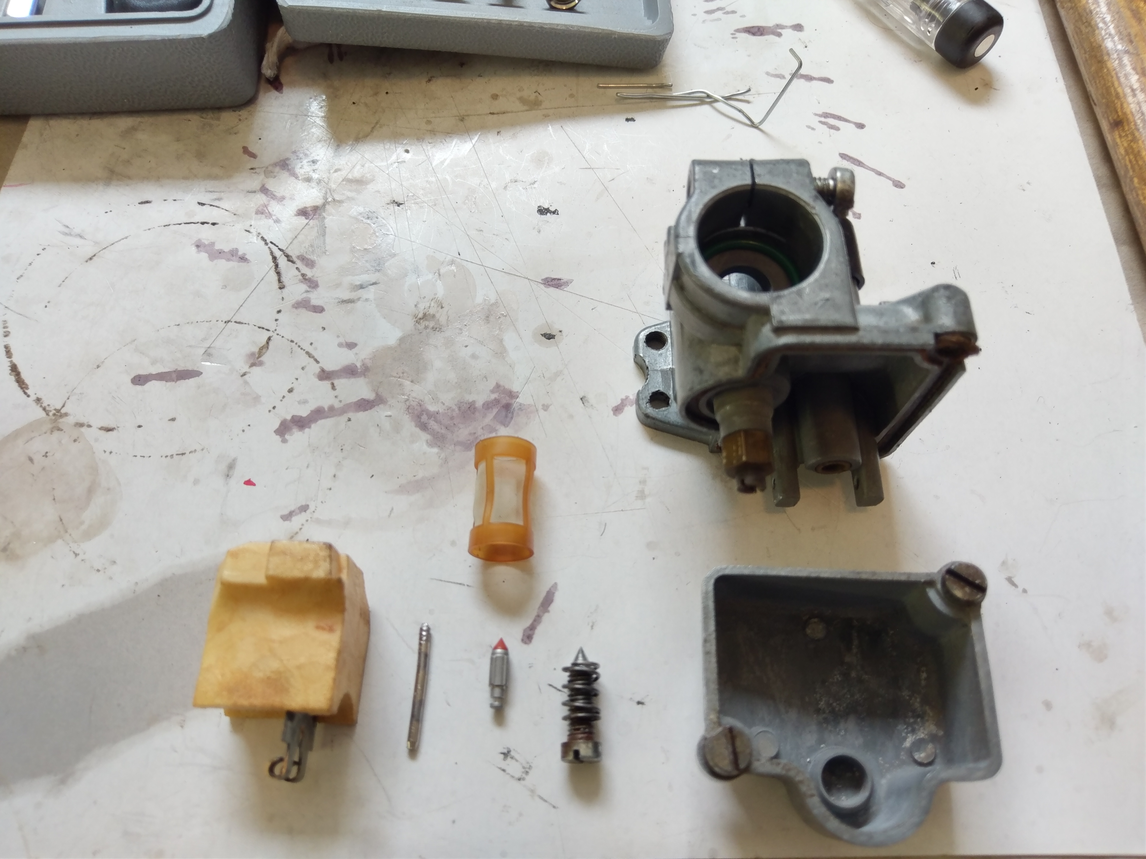 Erst hab ich mir den Vergaser vorgenommen, da ich ja Probleme mit dem Standgas hatte, wie Ihr mir netterweise geraten habt, hab ich den Vergaser zerlegt bis ich DAS Schwimmernadelventil freigelegt hatte. Es war Glücklicherweise schon da neue Modell mit dem Gummi Konus, stand auch Bing 101A Vergaser drauf Jona :lol: