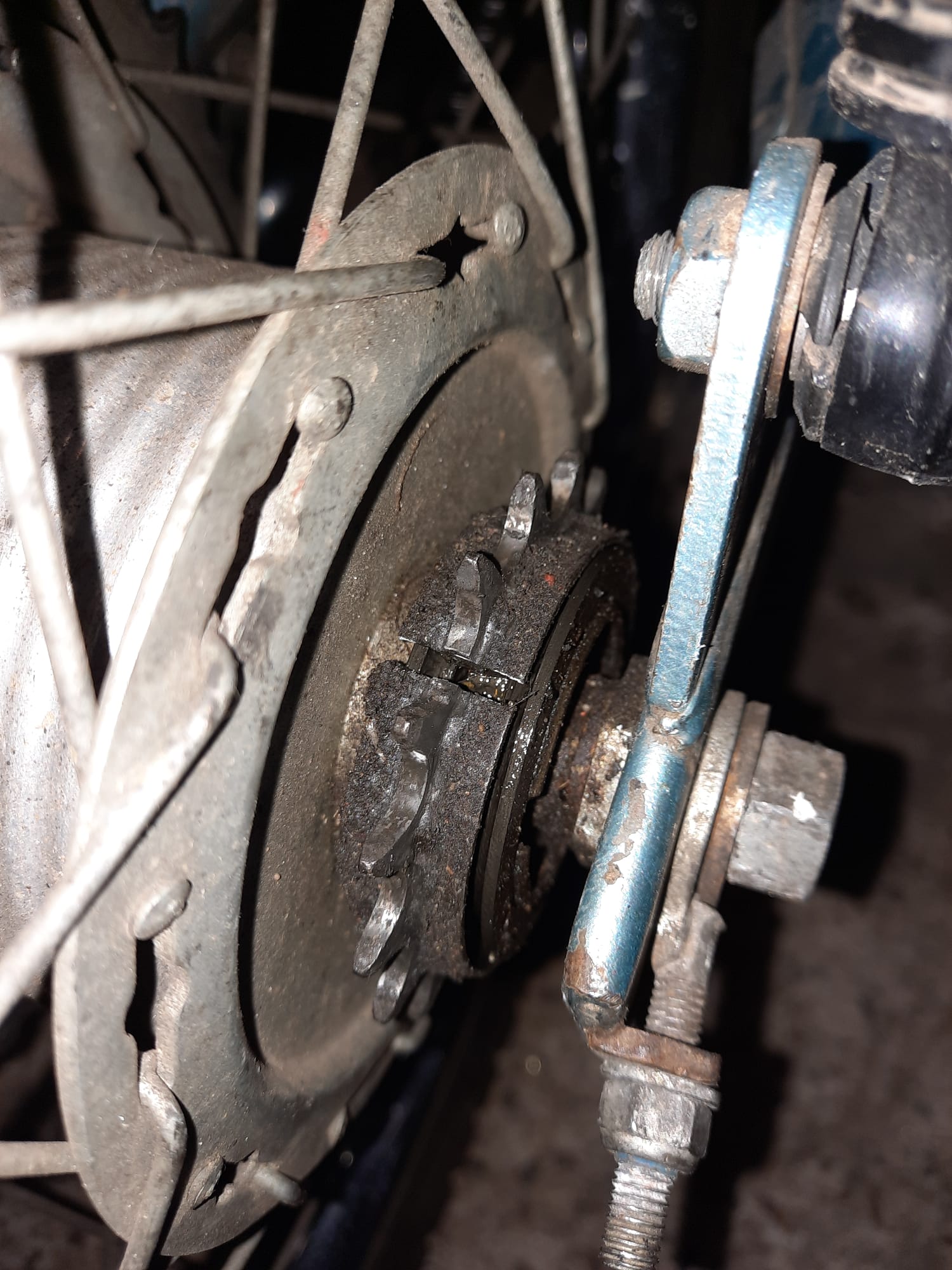 Heute das neue Kettenrad und gleich ein paar neue Bremsbacken montiert. Die Backen waren ein Krampf aber das Freilaufrad ging.
