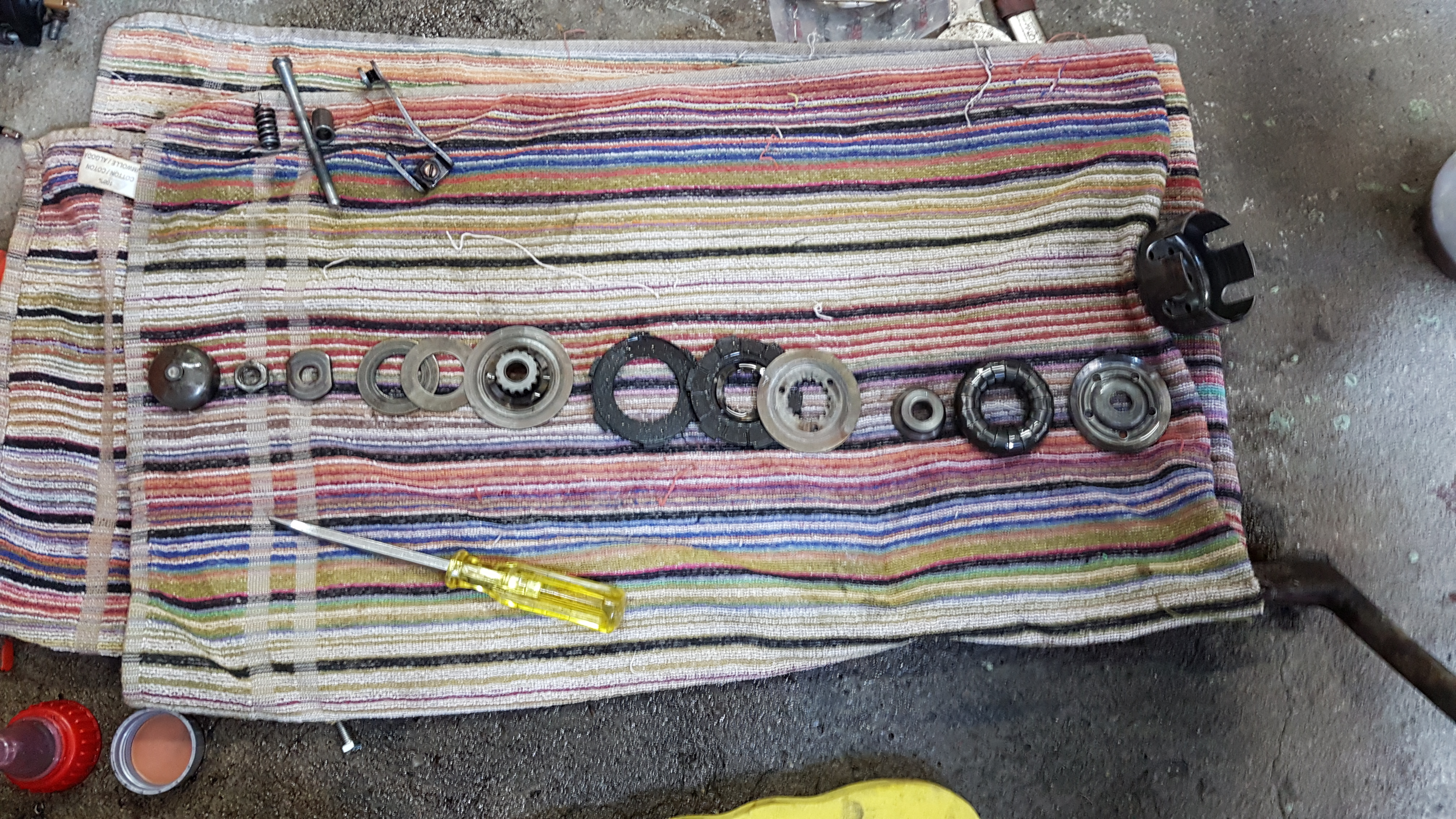 Die Wellfeder die die Kupplung auseinander drückt (Pos.17) ist scheinbar nur einmal vorhanden, die sitzen normalerweise immer zwischen allen drei Stahlscheiben, also müsste sie 2x da sein. Man kann sie auch weg lassen. Aber dann beide, also 2 einbauen oder keine.