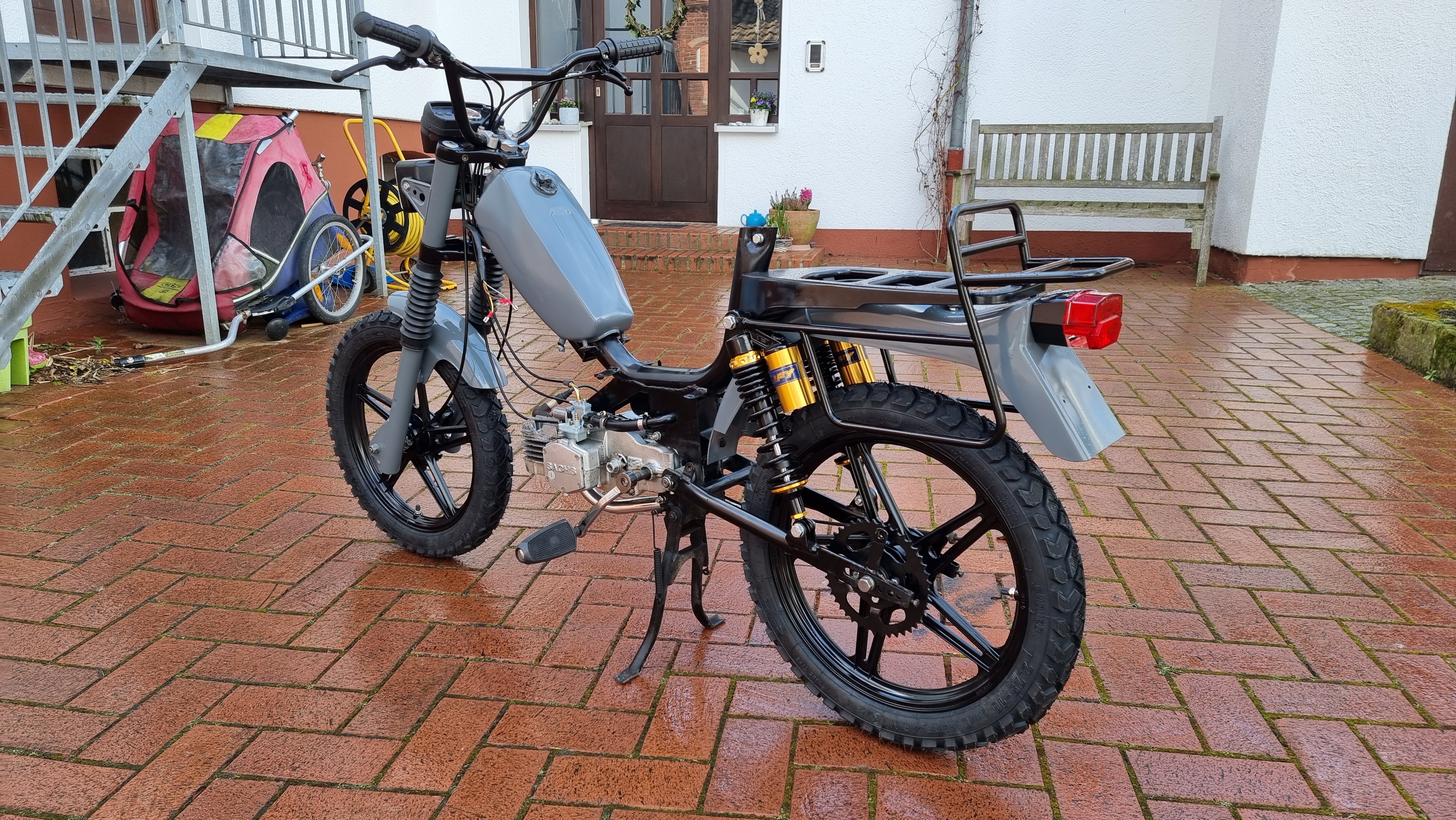 Du meinst mein anders Mofa wo ich den Luftfilter nach links umgebaut habe? Ja das habe ich gemacht. Läuft gut. Mit 12er Vergaser und 50er Düse. Habe ein 40er Kettenrad drauf. Fährt ca 40km/h nach GPS. Da schreibe ich auch gleich nochmal ein Update rein.
