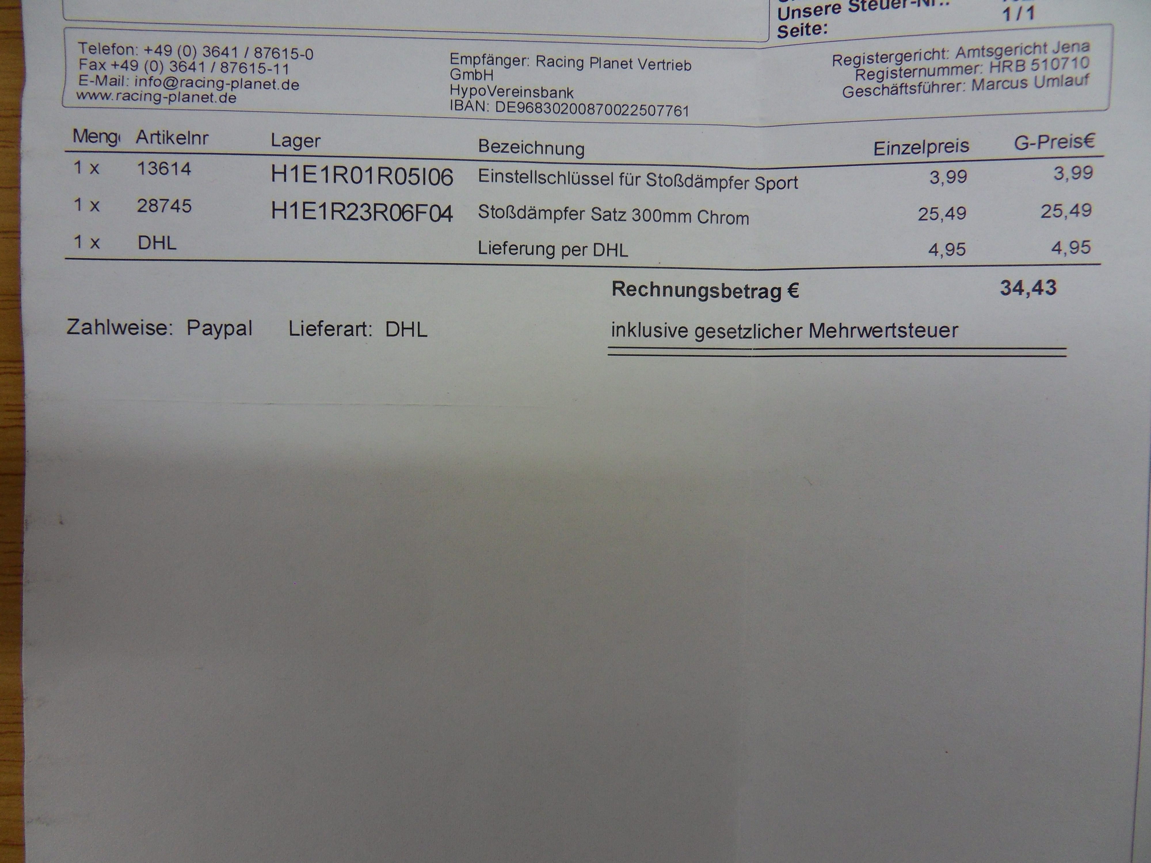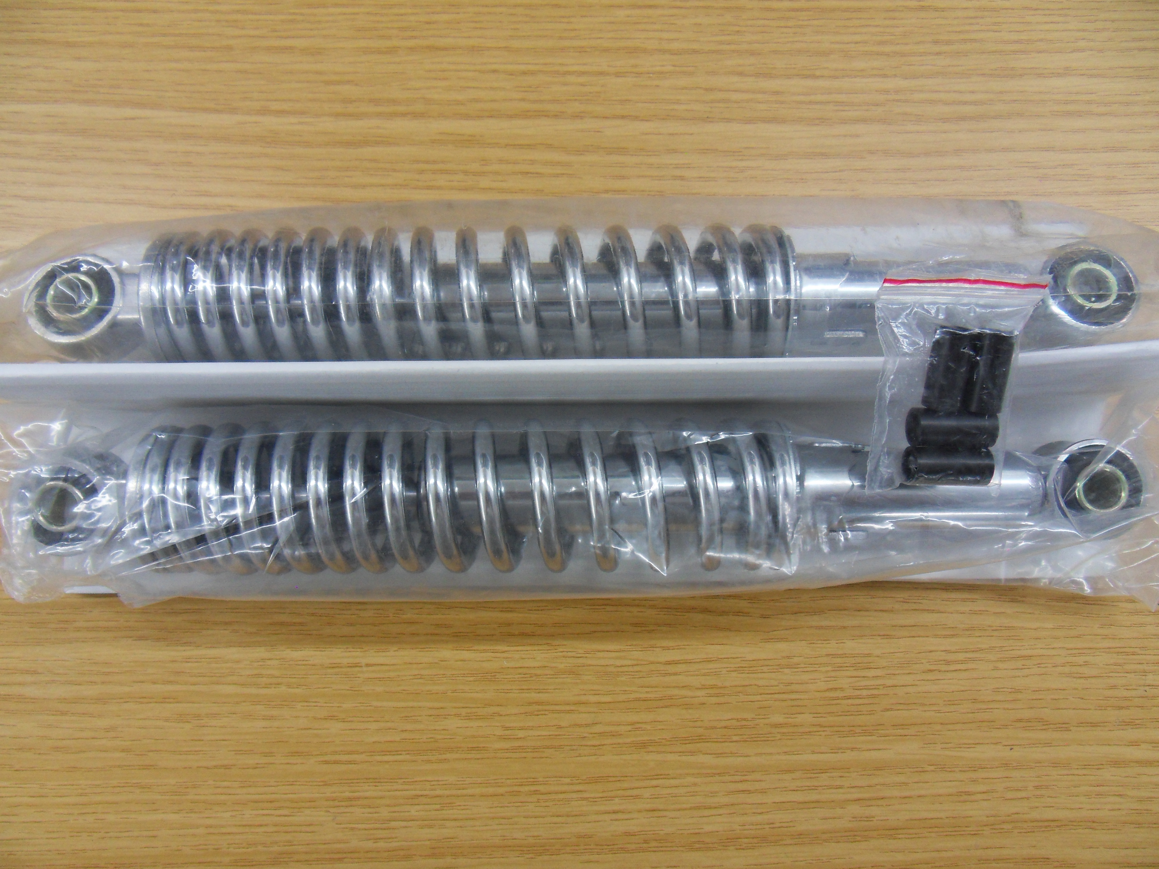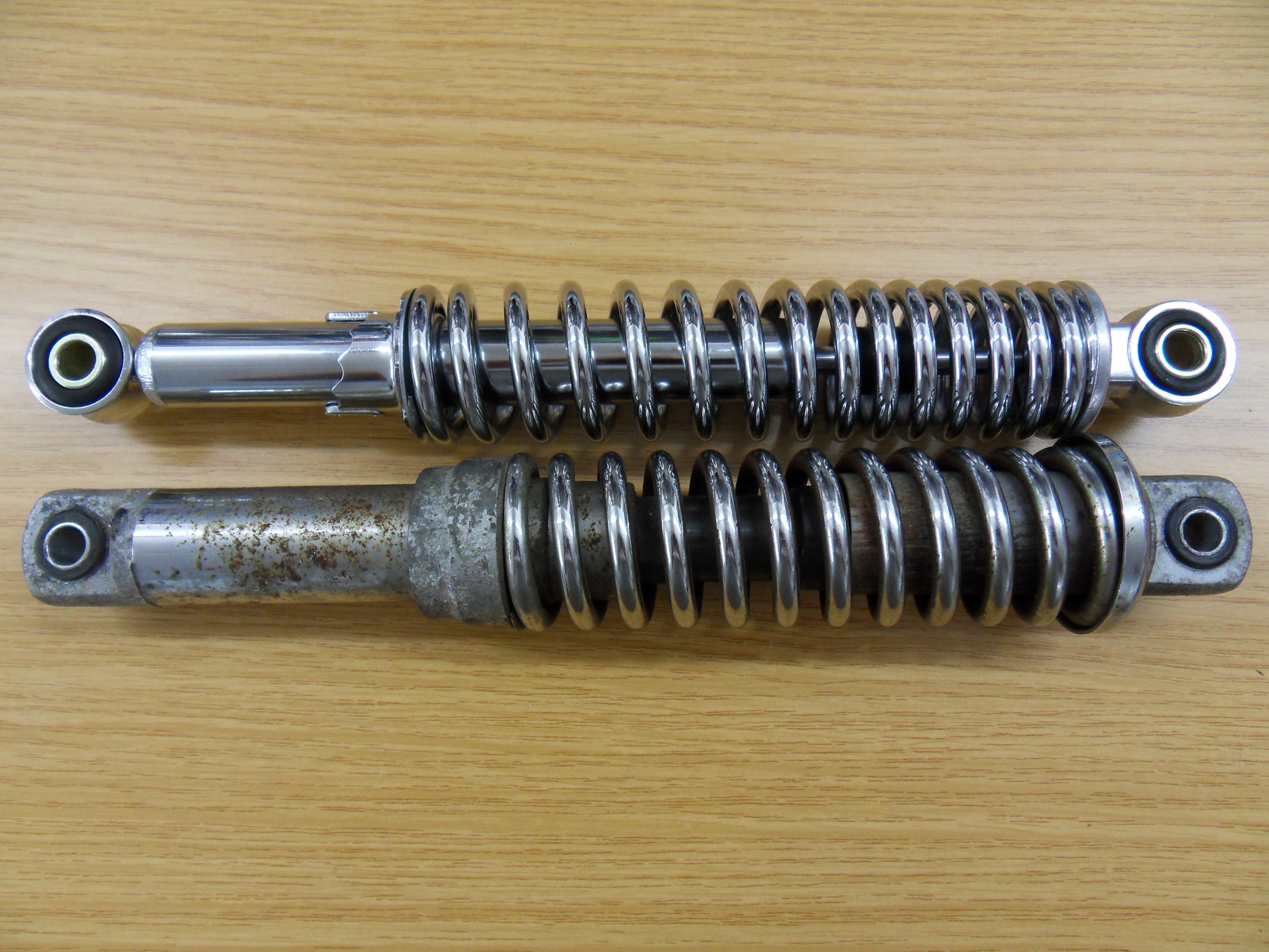 nachdem ich kürzlich beim Kauf von neuen Stoßdämpfern eine üble Überraschung erlebte (waren rostig und mit Augen aus Plastik :o ) habe ich diesmal mehr Glück gehabt. Meinen letzten Fang möchte ich Euch heute mal vorstellen. Die Dämpfer gibt es mit verchromter und schwarzer Feder in vielen verschiedenen Längen. Mit dabei sind 4 Reduzierhülsen von M10 auf M8. Die Härte lässt sich mehrfach verstellen, der Schlüssel dazu muss allerdings separat bestellt werden. Die Verarbeitung finde ich, wenn man den günstigen Preis bedenkt, absolut okay. Jedenfalls ein guter Ersatz ziemlich nahe am Original. Aber seht selbst...