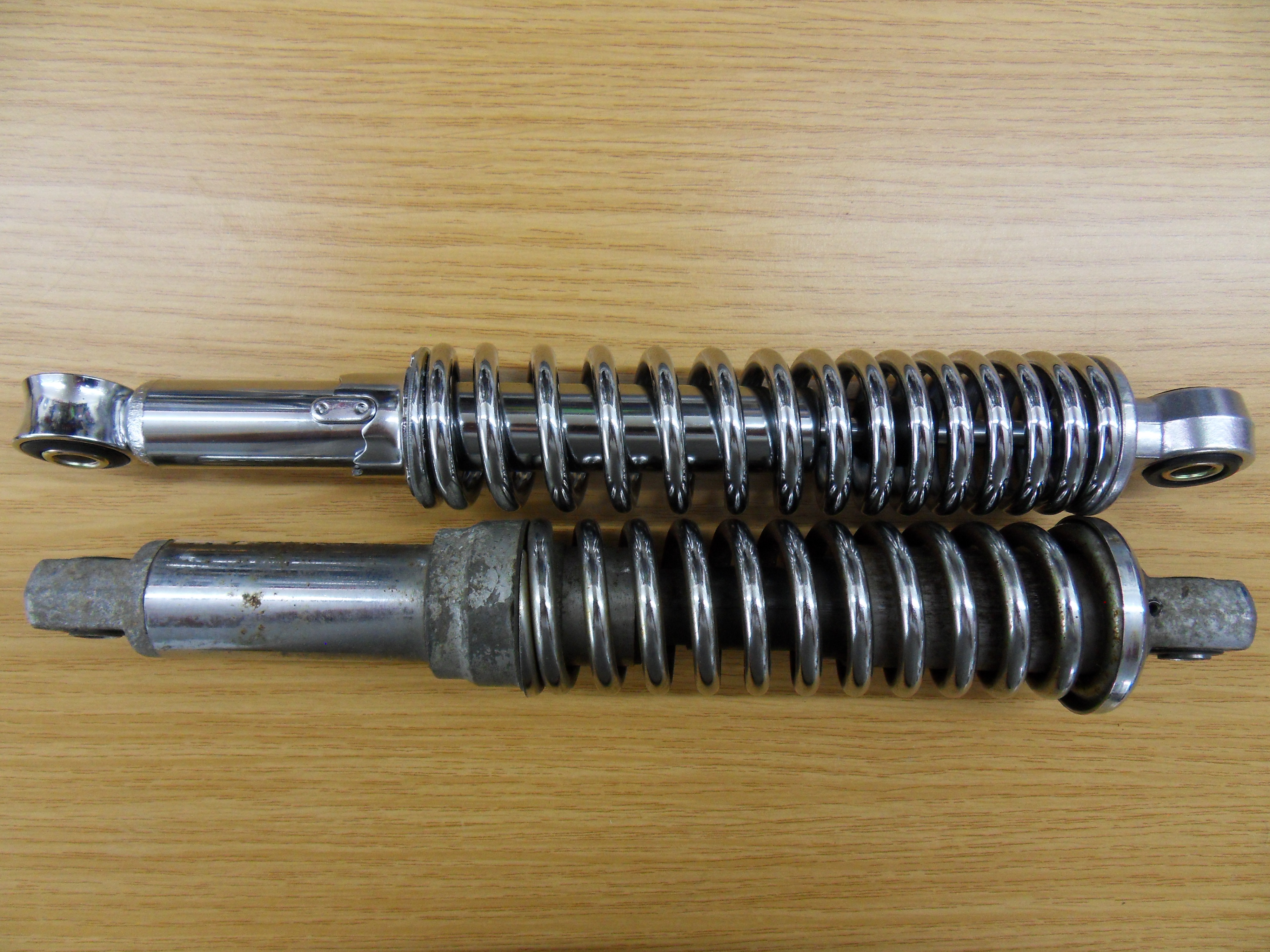 ) habe ich diesmal mehr Glück gehabt. Meinen letzten Fang möchte ich Euch heute mal vorstellen. Die Dämpfer gibt es mit verchromter und schwarzer Feder in vielen verschiedenen Längen. Mit dabei sind 4 Reduzierhülsen von M10 auf M8. Die Härte lässt sich mehrfach verstellen, der Schlüssel dazu muss allerdings separat bestellt werden. Die Verarbeitung finde ich, wenn man den günstigen Preis bedenkt, absolut okay. Jedenfalls ein guter Ersatz ziemlich nahe am Original. Aber seht selbst...