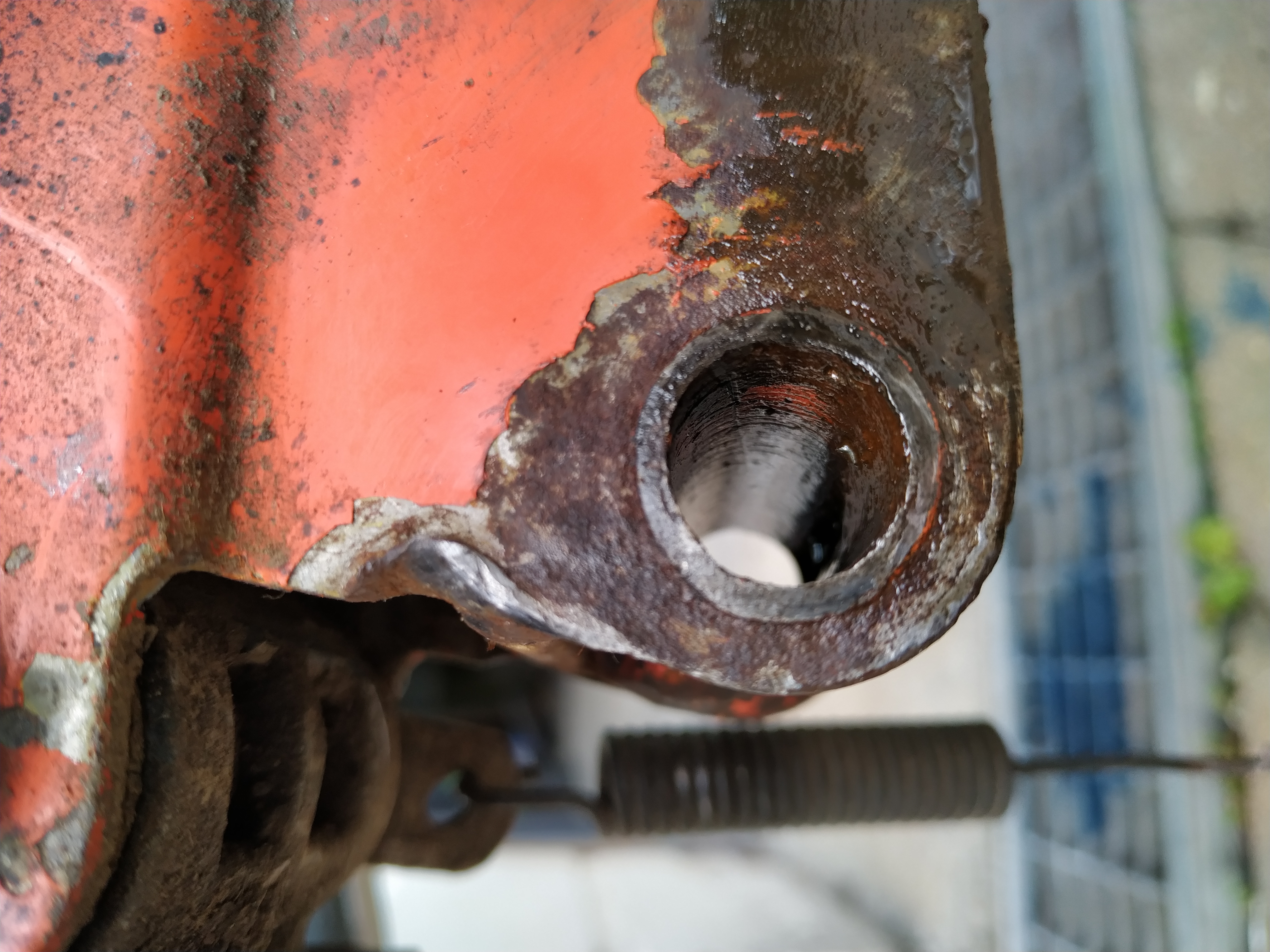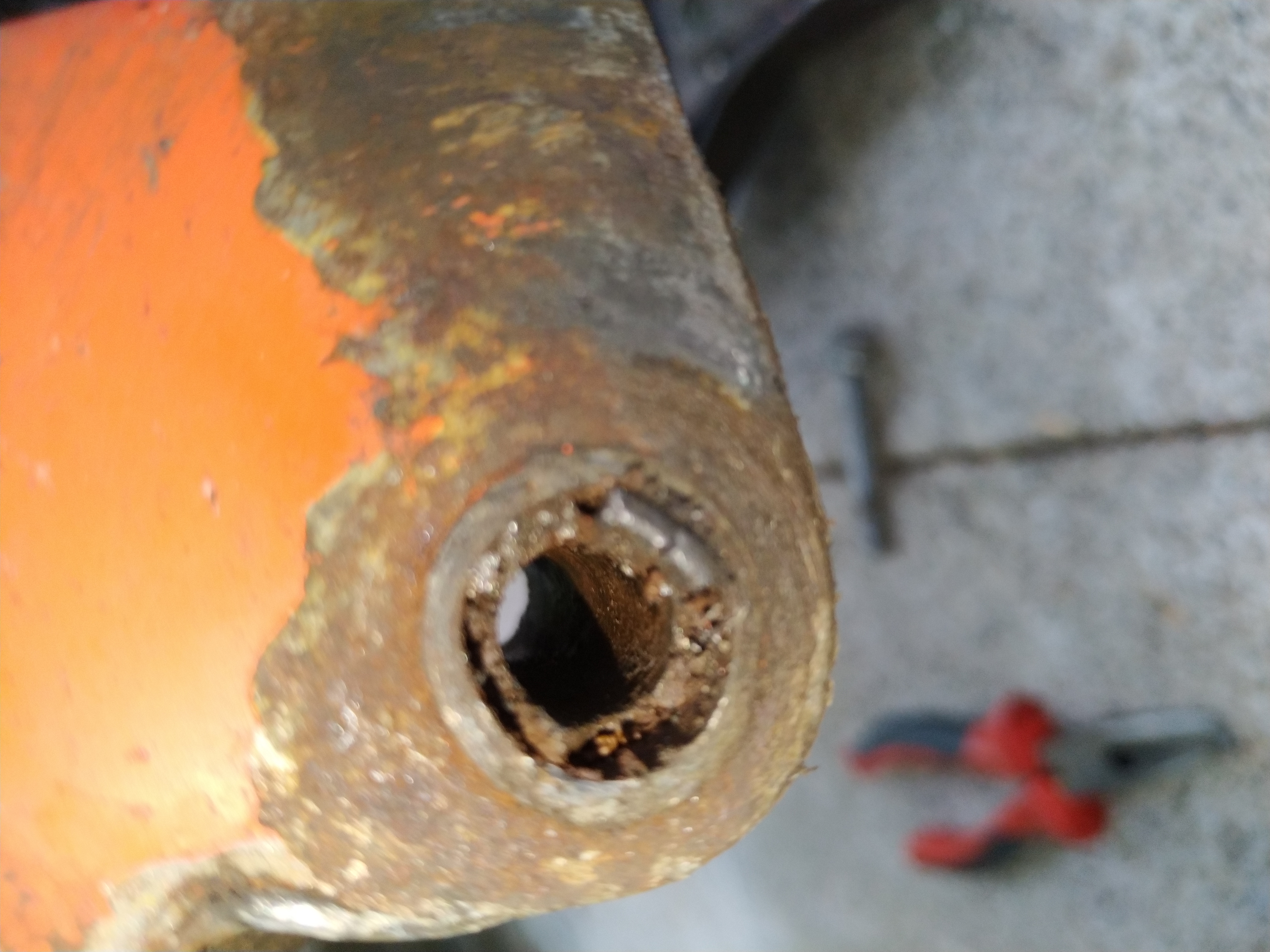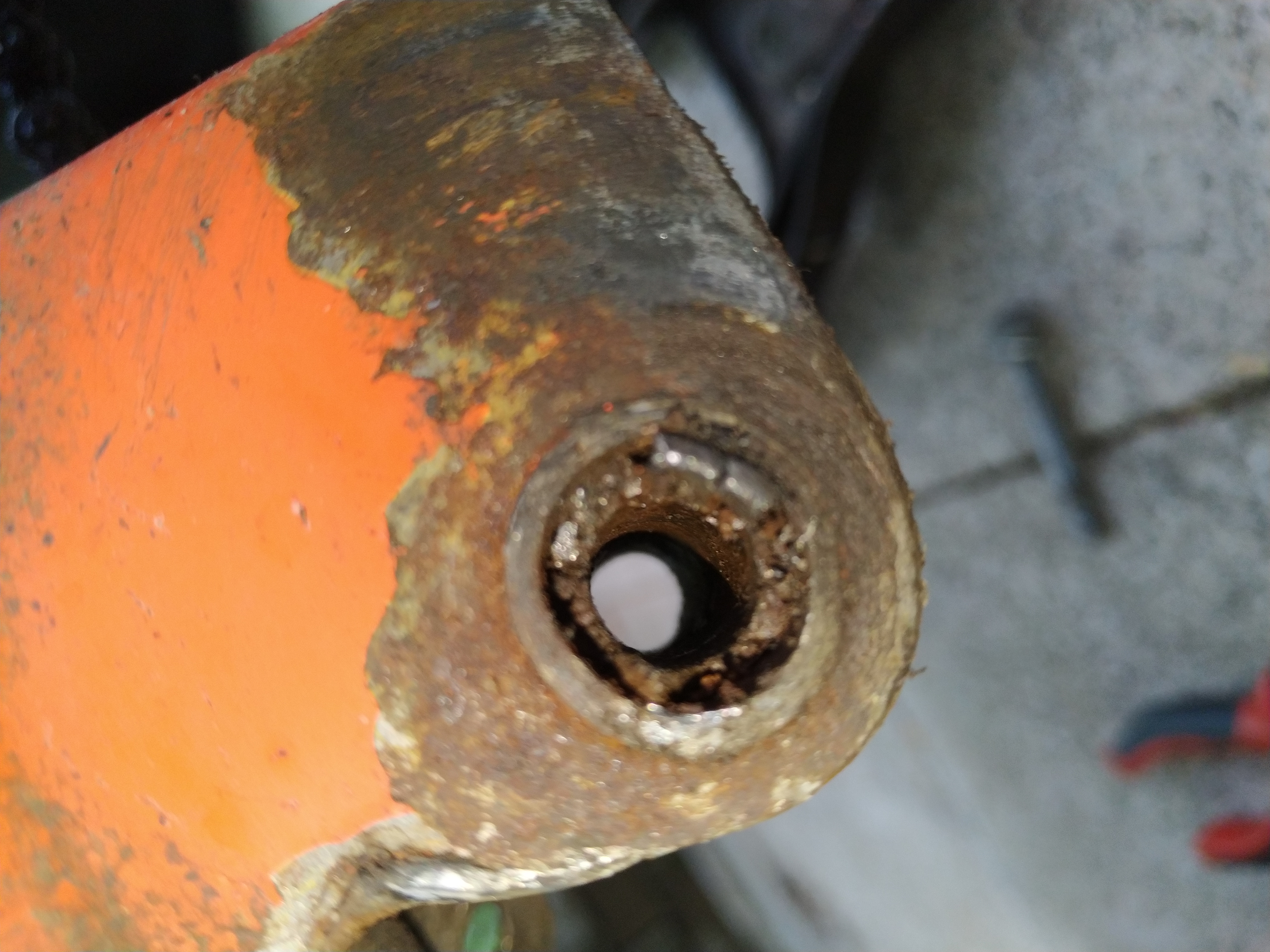 Leider haben wir letztens an "Mitch"'s M2 festgestellt das bei ihm die Buchse sich nicht mehr bewegen lies, sie war nicht aus dem Rahmen zu bekommen, und auch so hart das man sie nicht ausbohren konnte. Das wunderte mich, scheinbar war die Buchse durch das lange stehen und der bewegung der Schaube "aufgepilzt" an den Enden!? Keine Chance, nicht mit Hammerschlägen und auch nicht mit bohren die da raus zu bekommen.