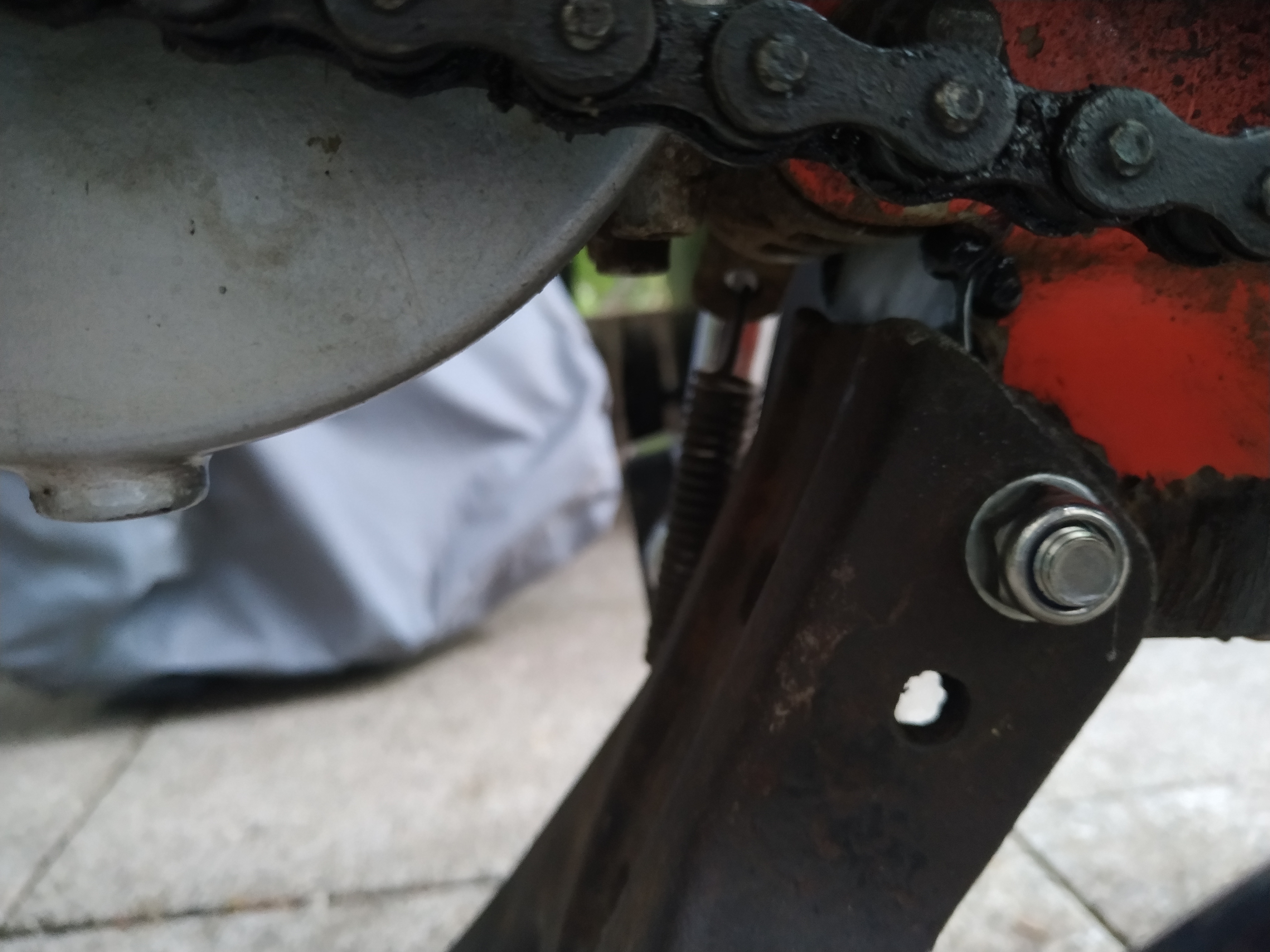 Unter deinem Ständer sind schon mal klötzchen geflickt worden. Das war oft die "erste" Lösung für das die Räder nicht auf den Boden kommen. Das packte das Problem aber am falschen Ende. Dein Ständer ist immer noch total krumm (auch in sich). Da er so krumm ist steht auch dein Vorderrad in der Luft. Normal ist der Aufstandpunkt am Boden deutlich weiter hinten das das Hinterrad frei ist!