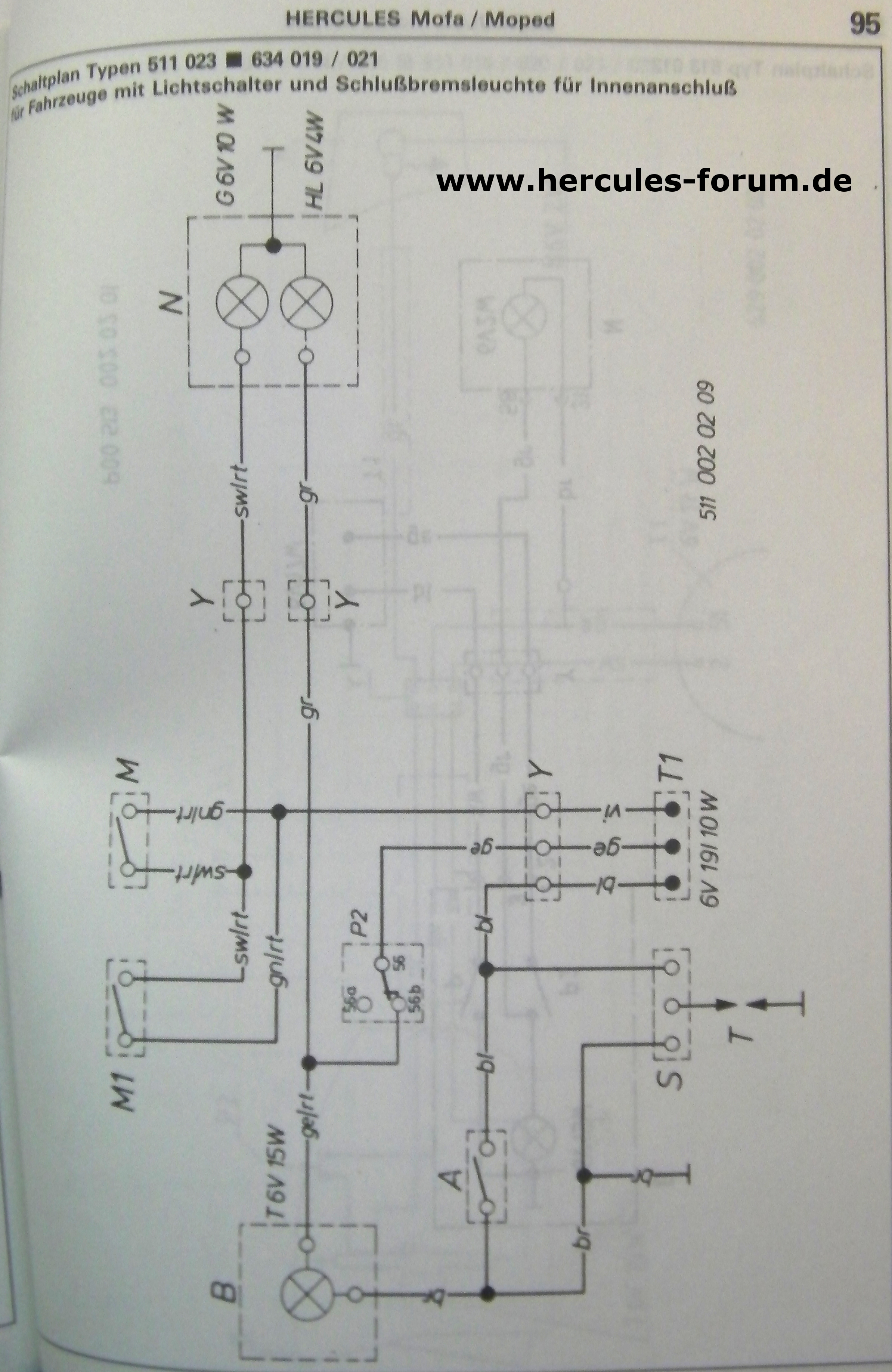 Die M5 hat zwar eigentlich den Typ 634 001 bzw 634 002, allerdings sind die Pläne von sehr frühen Hercules Prima 5 Mofas, die im Prinzip und von der Technik her bauähnlich zu deiner M5 sind. Ob BOSCH 6V 19W/5W oder BOSCH 6V 19W/10W sollte auch keine große Rolle im Schaltplan spielen.