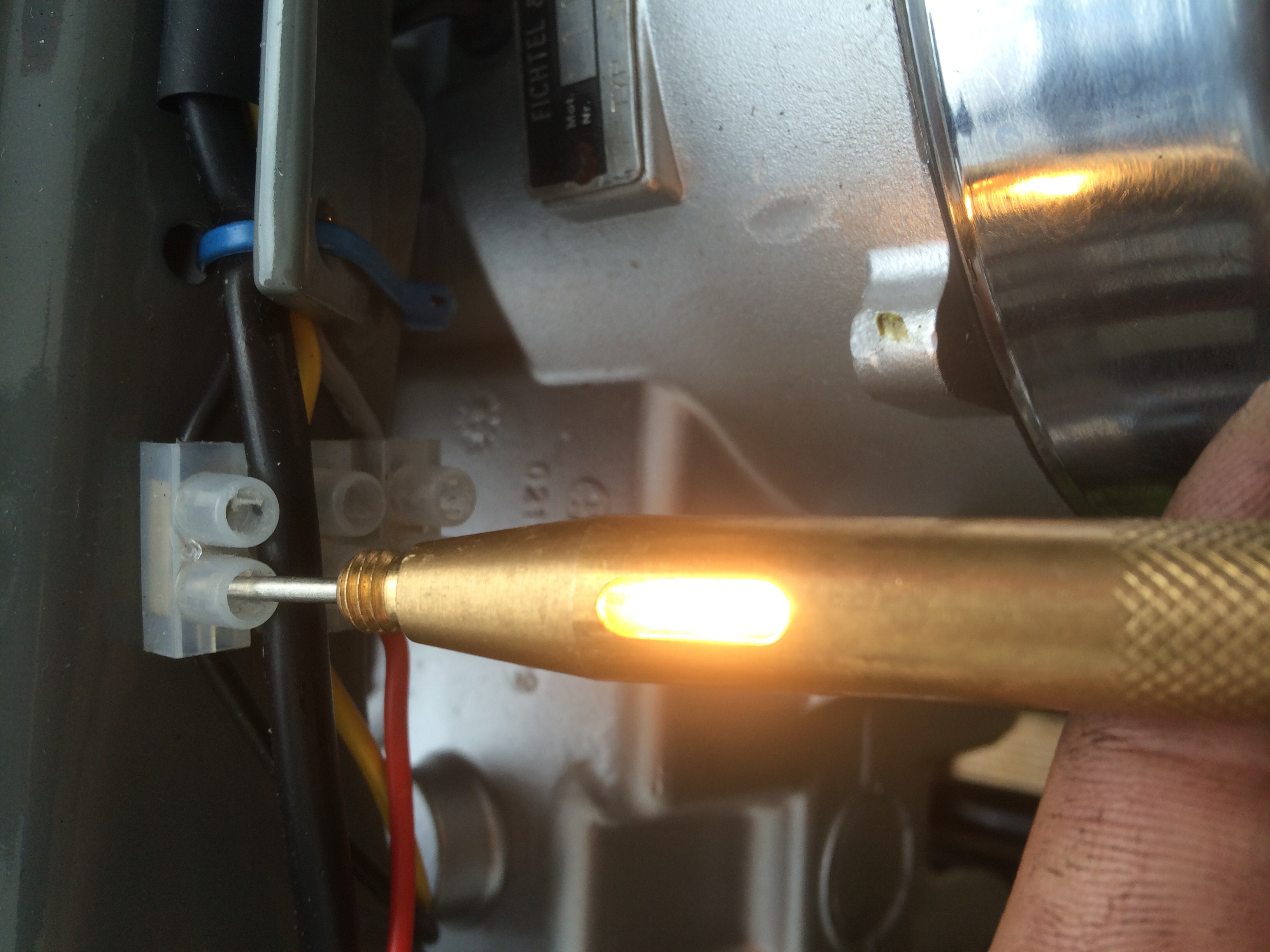 Ich habe mal die Lüsterklemme mit meinem 0815 Spannungsprüfer gemessen. Das schwarze Kabel leuchtet sehr kräftig aber das gelbe sowie graue (bzw. rot zur Rückleuchte hin) nur recht schwach. Ebenso schwach kommt der Strom auch an dem Kabel der Rückleuchte an.