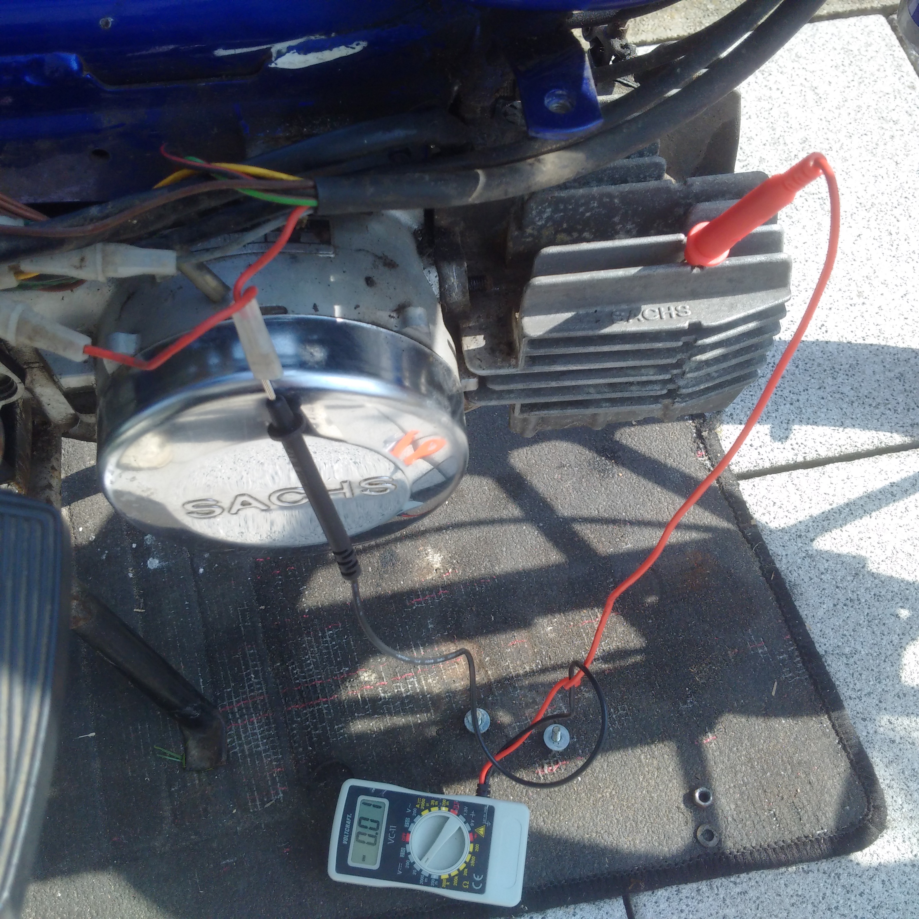 Relativ schnell stellte ich fest, dass ich keinen Zündfunke bekomme. Zündkerze und Zündkerzenstecker habe ich schon getauscht, nichts passiert. Daher wollte ich mich heute mit dem Multimeter mal auf Spurensuche begeben. Zündspule ausgebaut und Spannung gemessen.