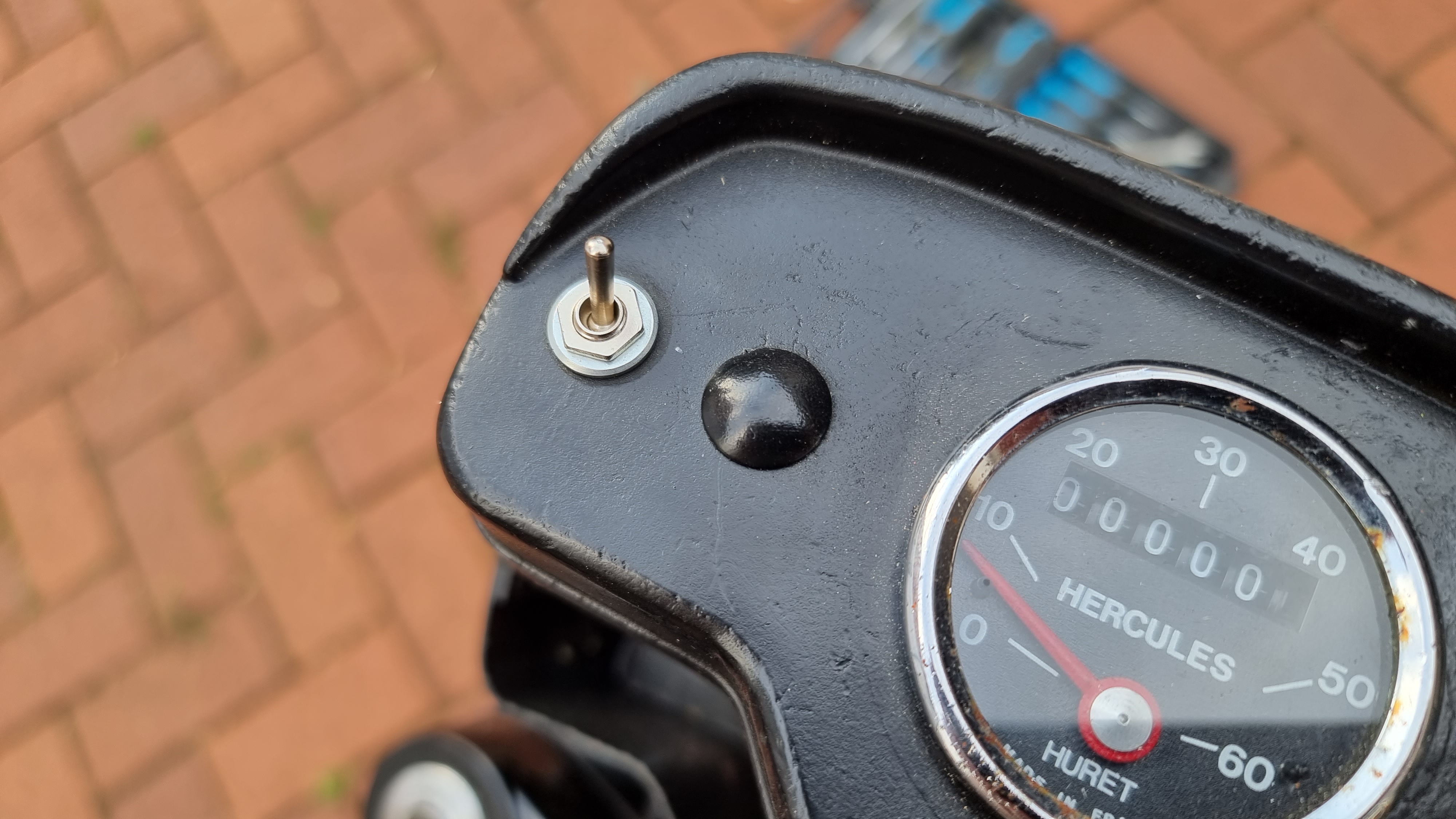 Ich hab mir jetzt doch nen kleinen Schalter besorgt. Ich find so ein Kippschalter besser und man hat nicht noch mehr Kabel am Lenker. So ist alles im Cockpit verbaut. Die 25Watt Lampe werd ich mir bei Gelegenheit noch besorgen.