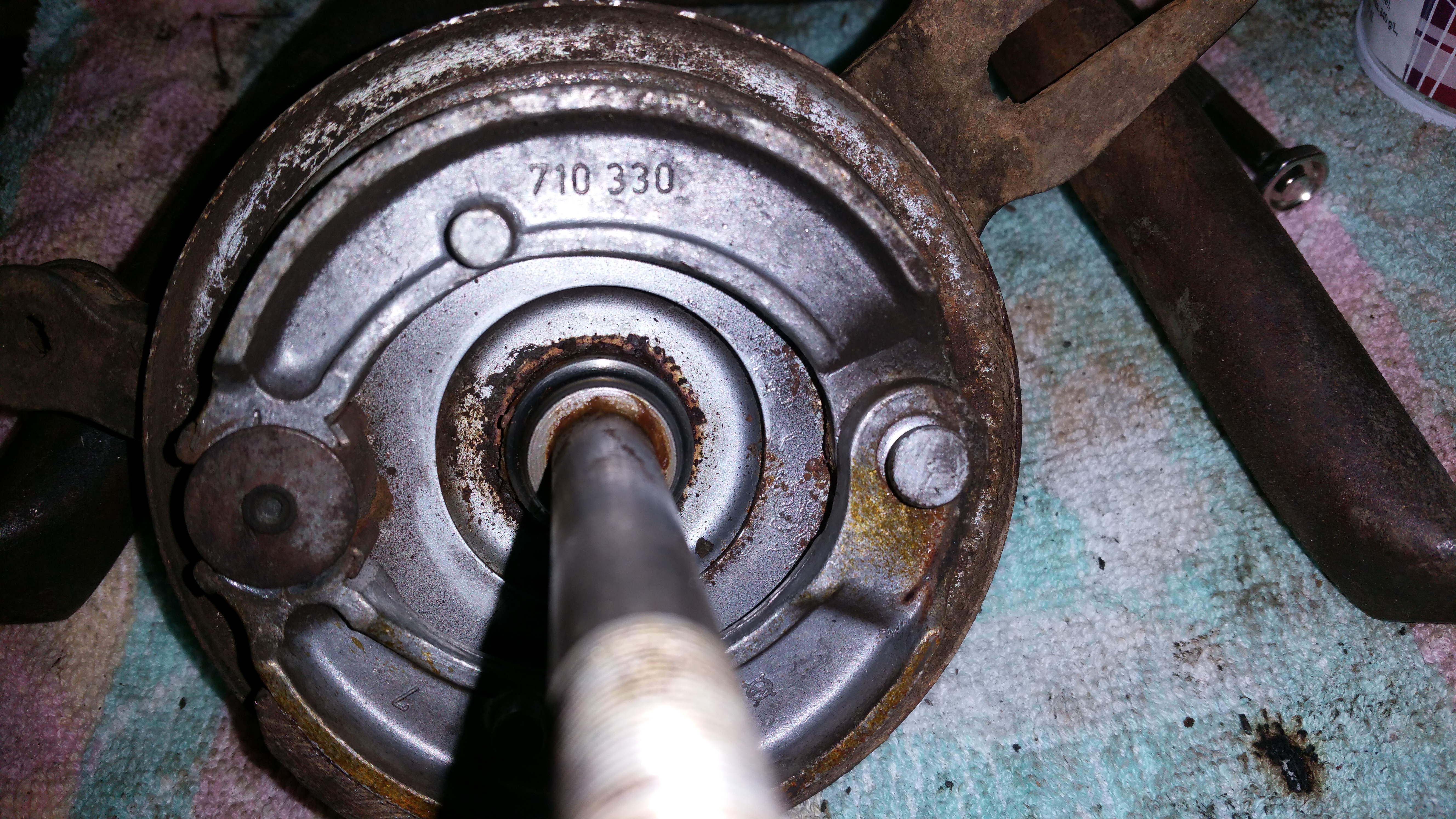 Hab dann gleich mal geprüft, wie der Zahnkranz befestigt ist. Dieser ist geschraubt. Allerdings sitzt vor den Schrauben ein Sicherungsblech. Dieses Blech ist durch eine winzige Punktschweißung an den Schraubenköpfen des Zahnkranzes befestigt und muss abgehebelt bzw. abgemeißelt werden. Ist nicht sonderlich schwer.....