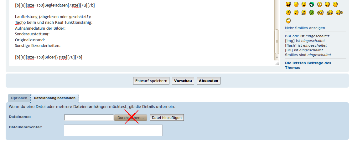 Die Bilder können direkt im Forum hochgeladen werden. So ist sichergestellt, dass Ihr darüber die volle Kontrolle habt und die Bilder NICHT irgendwann gelöscht werden. Dabei könnt Ihr so vorgehen...