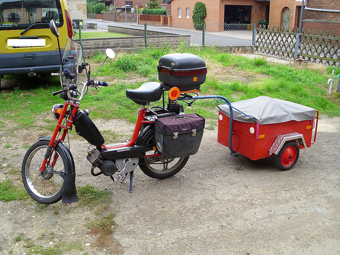 Hab mir heute (Freitag) einen größeren Mofa-Anhänger gekauft, der ist aber eine richtige Baustelle. Bilder folgen.
