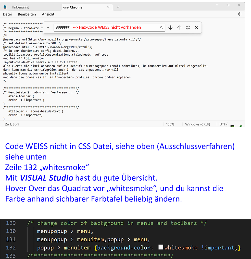 alles nicht so einfach mit dem suchen...denn die änderung auf die neue version 115 hatt da vieles außer kraft gesetzt, diese css beispiele gehn größtenteils nicht mehr, sonst wäre es easy. dann hätte ich das hier gar nicht reingestellt.