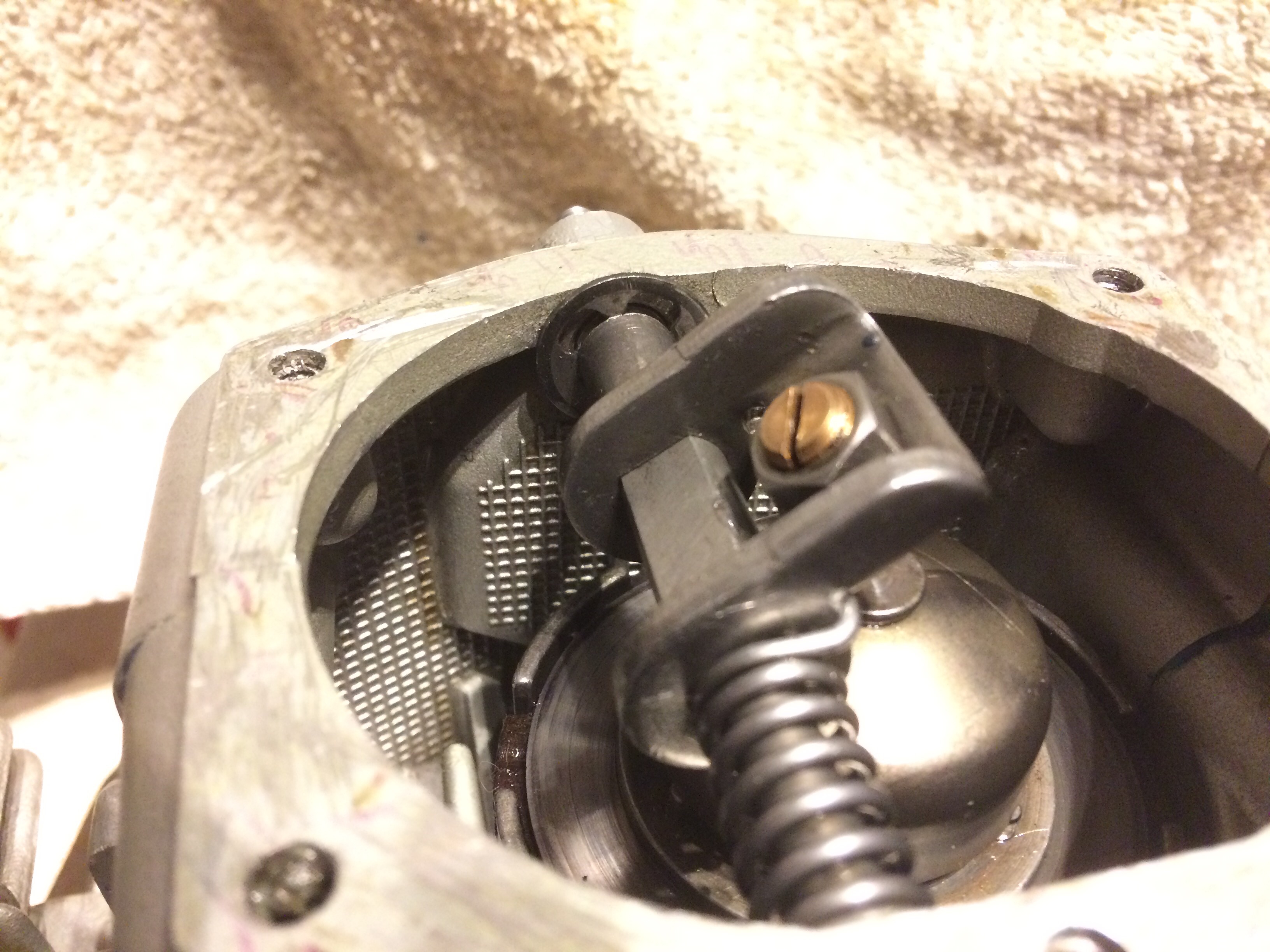 ohne Anschlag oben geht nichts! Noch mal an Erwins Lösung halten. Feder raus, Bolzen nach links drehen so dass die Stellschraube nach hinten bzw. Innen steht. Feder setzen und Bolzen nach rechts drehen und damit spannen. Die Stellschraube sitzt jetzt also auf der Glocke. Spannung fest halten und gleichzeitig oben den Hebel drauf schrauben. In Deinem Fall fehlt ja der Anschlag.