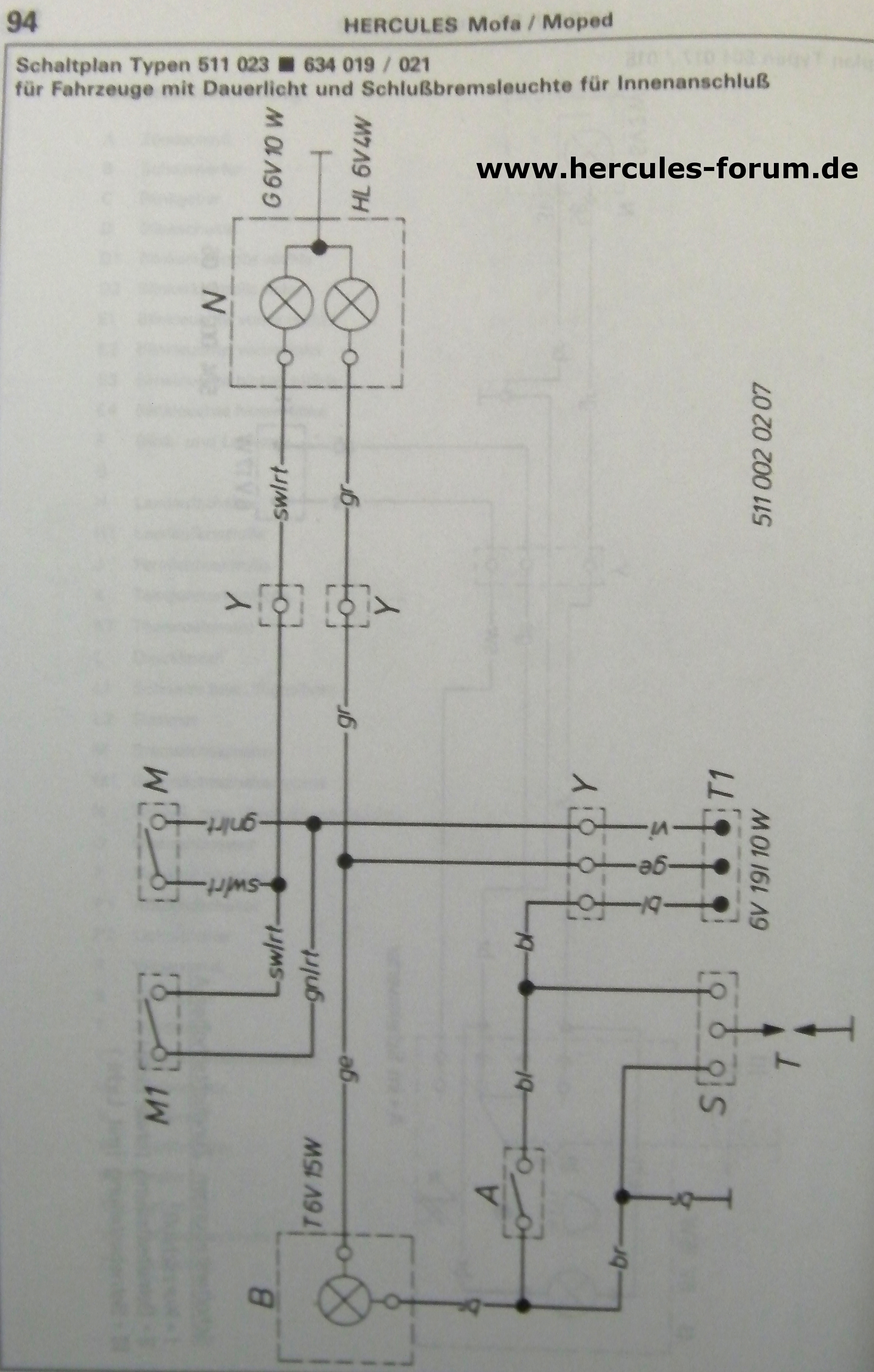 Die M5 hat zwar eigentlich den Typ 634 001 bzw 634 002, allerdings sind die Pläne von sehr frühen Hercules Prima 5 Mofas, die im Prinzip und von der Technik her bauähnlich zu deiner M5 sind. Ob BOSCH 6V 19W/5W oder BOSCH 6V 19W/10W sollte auch keine große Rolle im Schaltplan spielen.