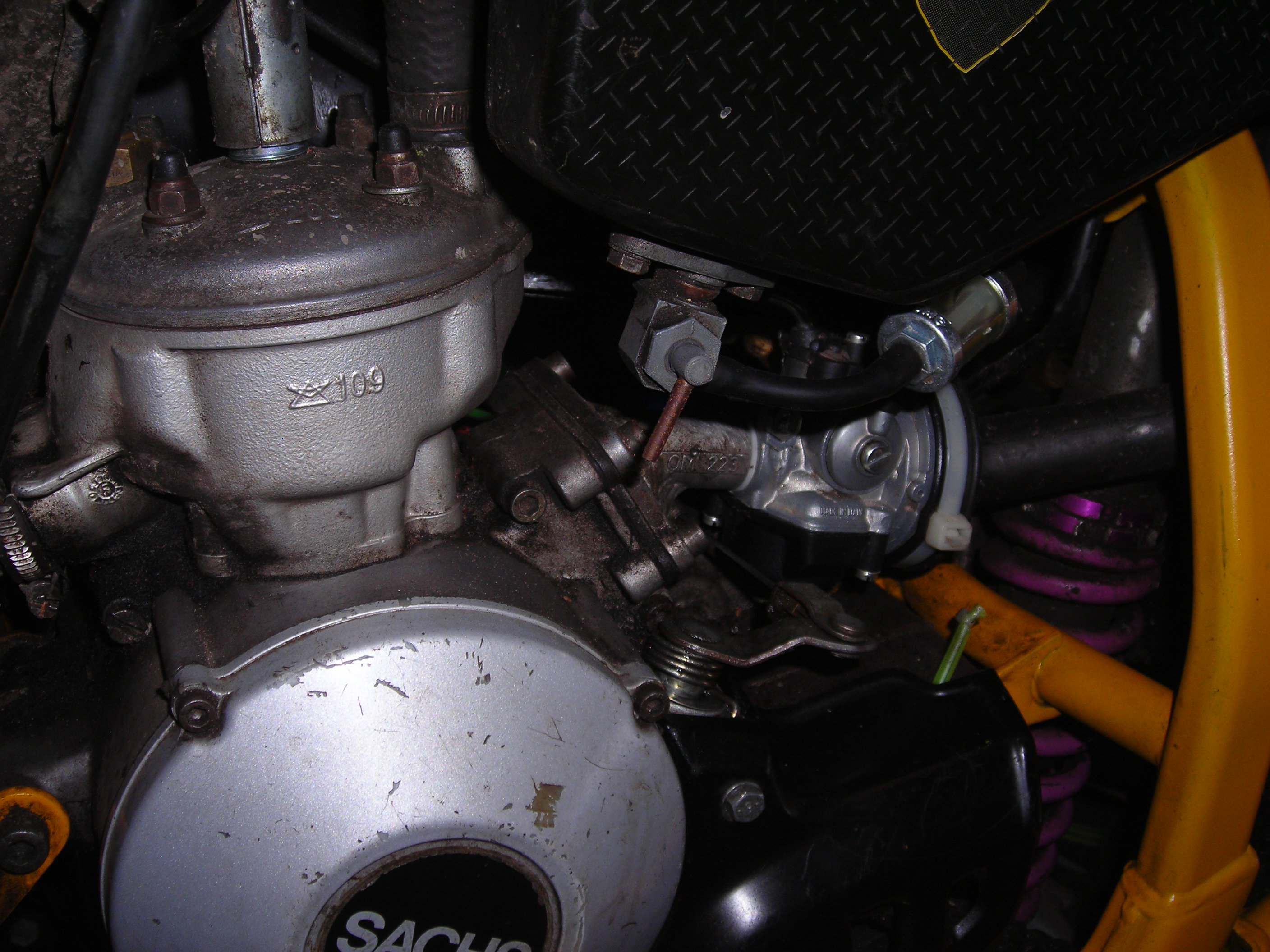 Zudem scheint der Vergaser auch nicht der richtige zu sein. Und die Verbindung von Vergaser zu Luftfilter hat einen viel zu großen Durchmesser. Siehe hier: