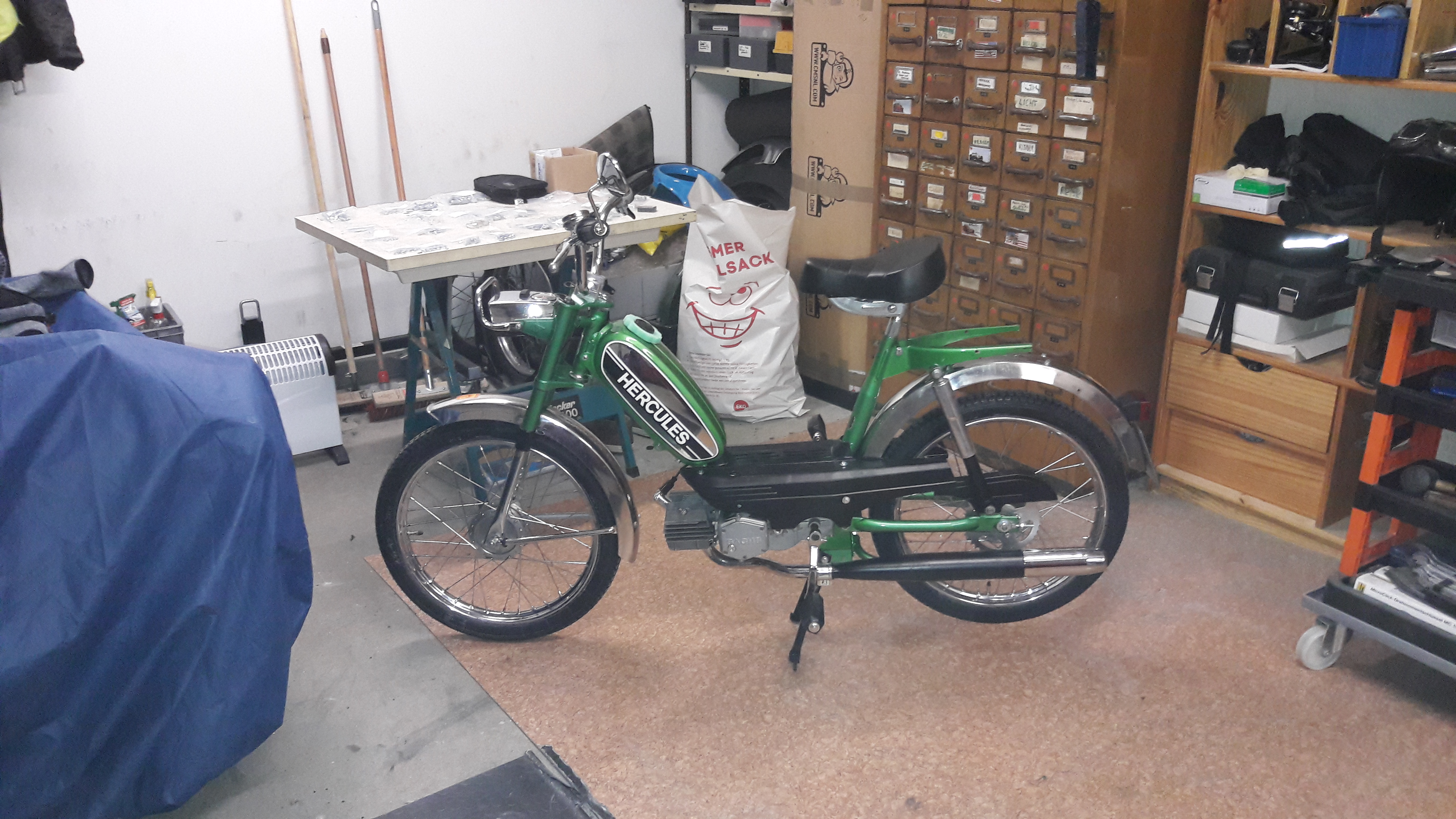 das Irishgrün gefällt mir auch richtig gut! Als ich das Moped bekommen habe, war ich nach der Demontage mit dem Lack etwas unentschlossen. Teilweise war der Originallack zwar unheimlich eingeschmoddert, unter der ganzen Schmutzschicht aber noch richtig gut. Vielleicht hat der Dreck ja sogar konservierende Wirkung. Teilweise war der Lack aber völlig hinüber (z.B. der Gepäckträger, die Auspuffhalterung und auch alles rund um die Motor- und Ständeraufnahme).