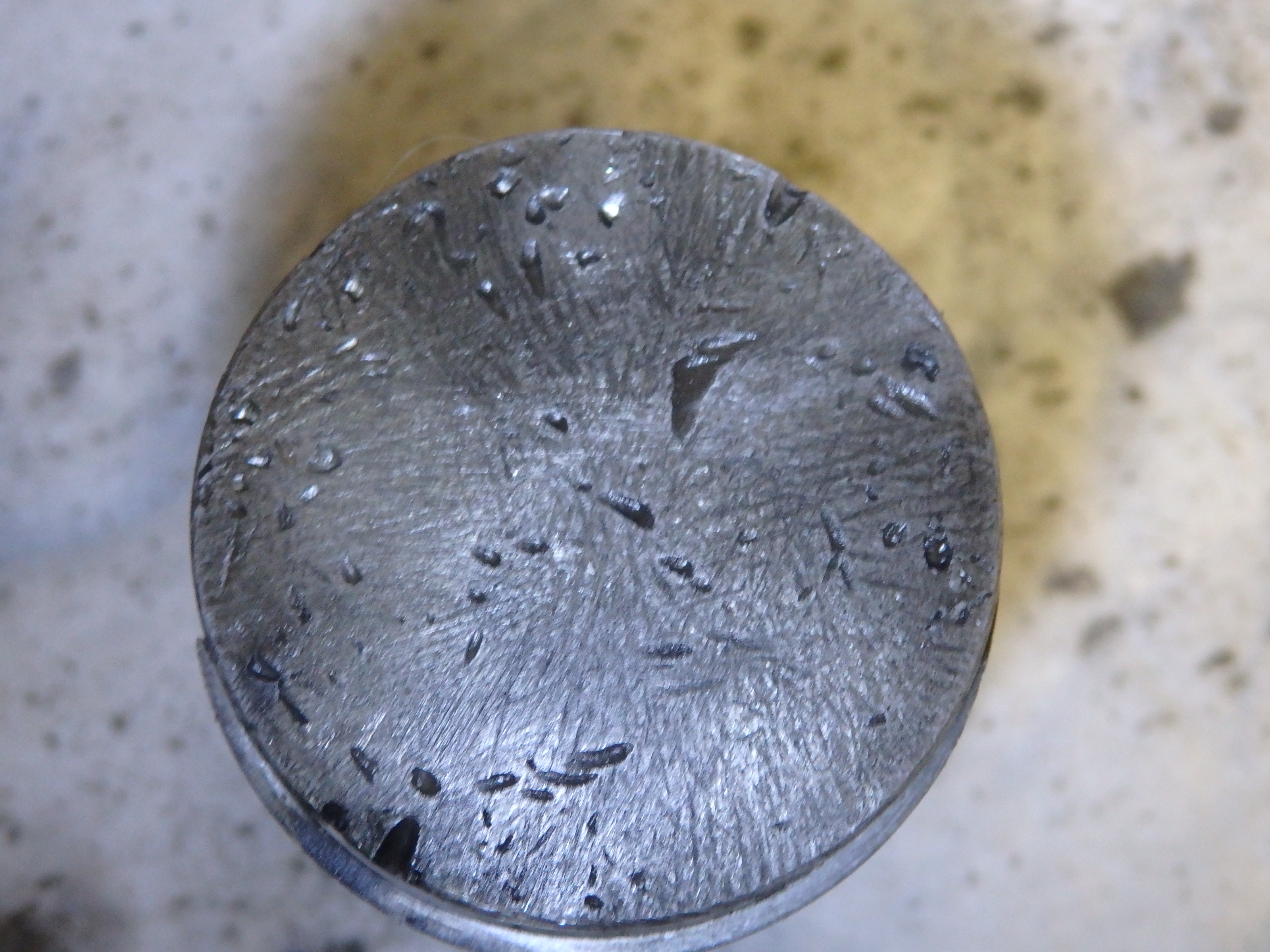 Im Kurbelgehäuse fanden sich noch nicht weiter untersuchte Brocken, ich nehme an, daß die vom Kolbenring stammen. Weitere Brocken fand ich im Sackzylinder, wo sie entsprechende Spuren hinterlassen hatten, und auch am Kolbenboden. Macken finden sich auch an den Rändern der Überströmkanäle. Ich nehme an, daß sich das untere Pleuellager irgendwann verabschiedet hat und als Folge der schlechteren Führung des Kolbens dann der Ring gebrochen ist und durch die Kanäle in das Gehäuse und den Brennraum geraten ist.