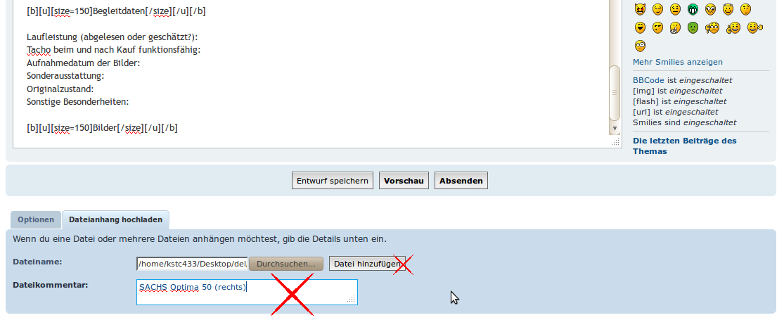 Die Bilder können direkt im Forum hochgeladen werden. So ist sichergestellt, dass Ihr darüber die volle Kontrolle habt und die Bilder NICHT irgendwann gelöscht werden. Dabei könnt Ihr so vorgehen...