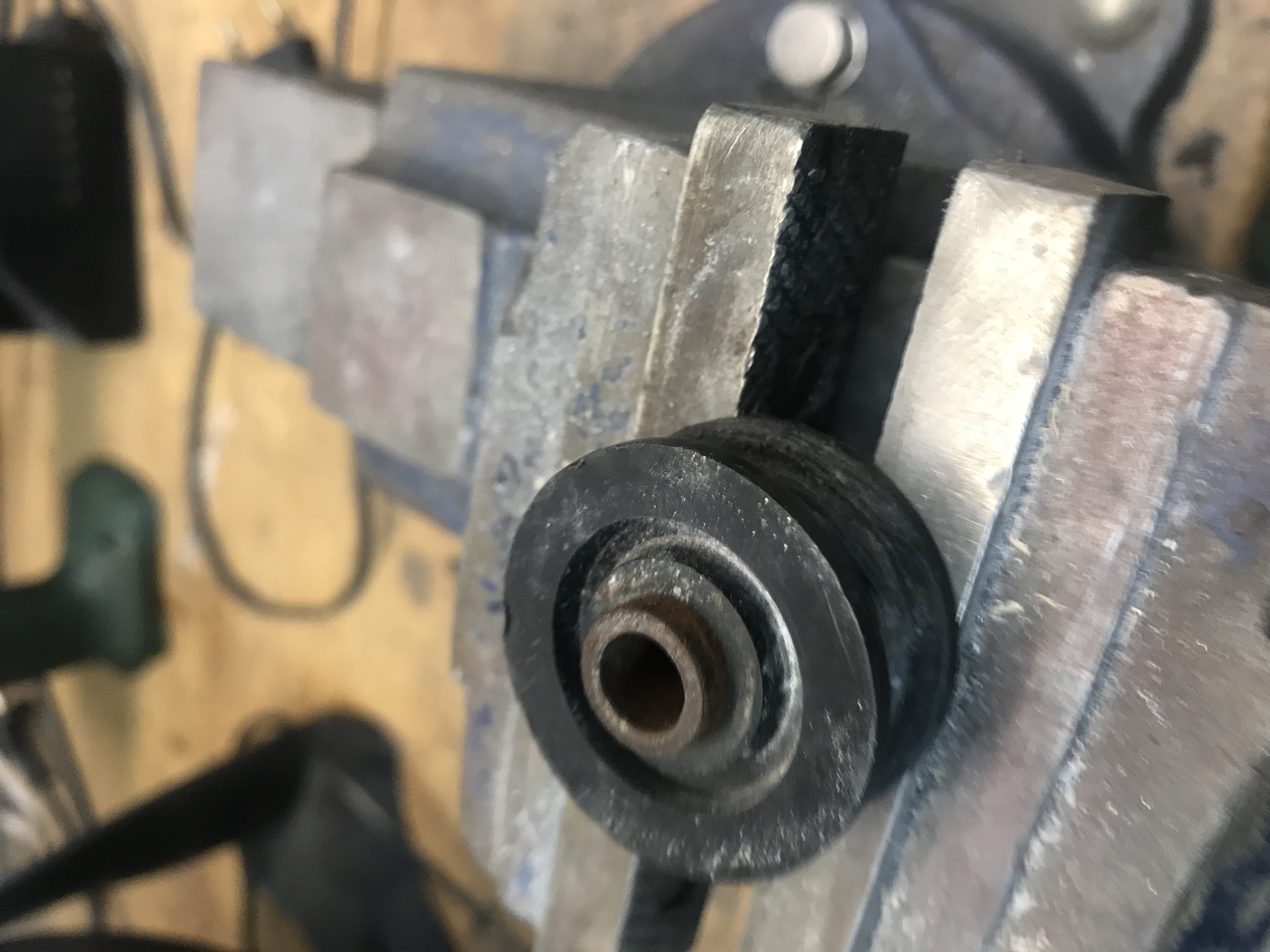 Ist nun auch ein prima Zentrierbock. Rad mit Achse einfach auflegen und testen. Heute abend kommt noch ne Messuhr, aber es ging erstaunlich gut, wenn man mit nem Schraubendreher den Abstand abtastet. Läuft jetzt schon sehr rund - für ein Mofa gut genug.
