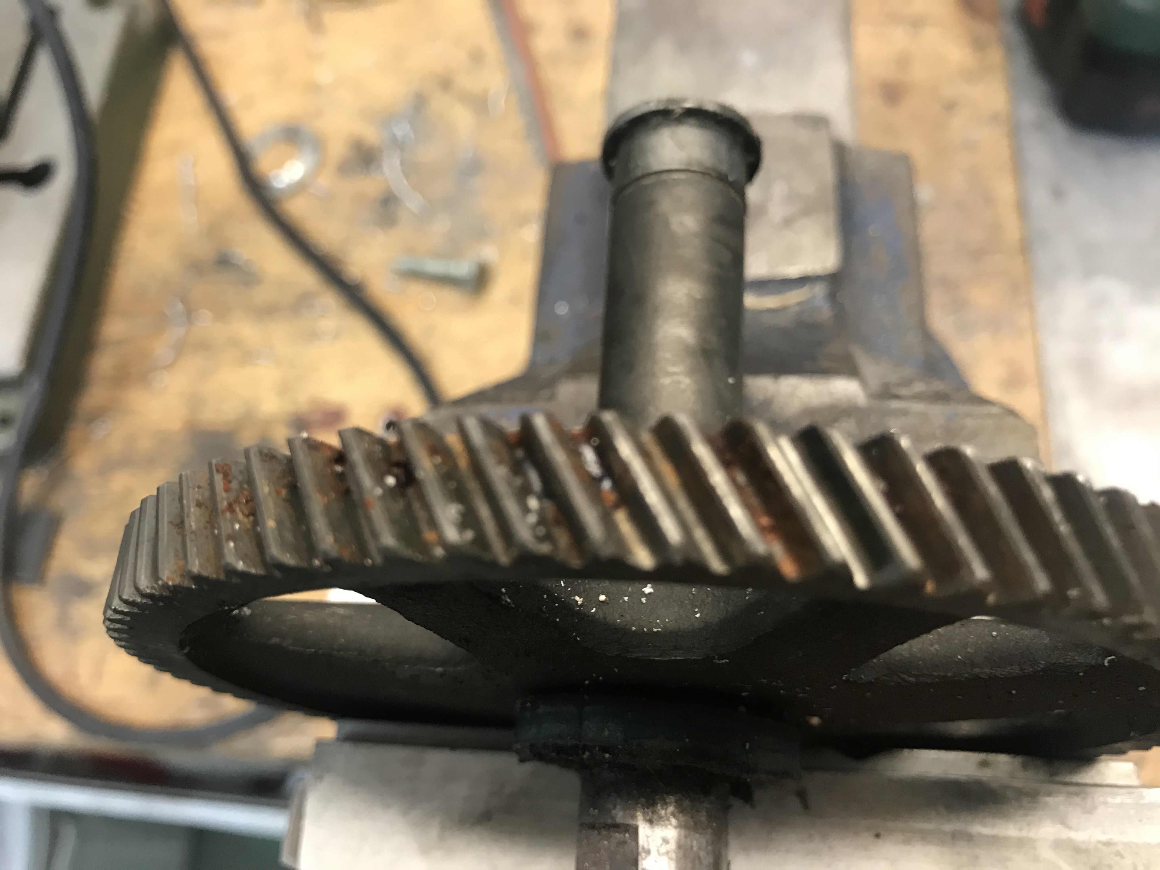 Da hats wohl den Simmerring rausgehauen. Kondensator und Kontakt hab ich ersetzt. Und nun wirds Zeit um reinzuschauen. Da hatte ich erst Schiss, daß das total korrodiert ist, aber das war wohl nur oberflächlich, die kleinen Ausbrüche an den Flanken sollten nix machen. Insofern sieht das alles sehr gut aus, das Gehäuse ist nur total versifft. Morgen geht es an den Dampfstrahler.