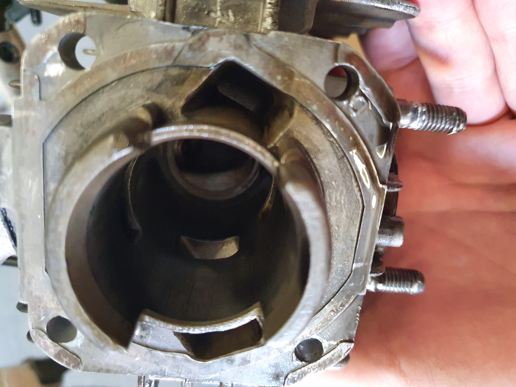 Heute habe ich mal den Zylinder demontiert. Es ist ein Originaler 476er, mit scheinbar neuem Kolben (ca. 50mm lang). Der Zylinder ist unbearbeitet und ohne Riefen. Kompression ist gut.