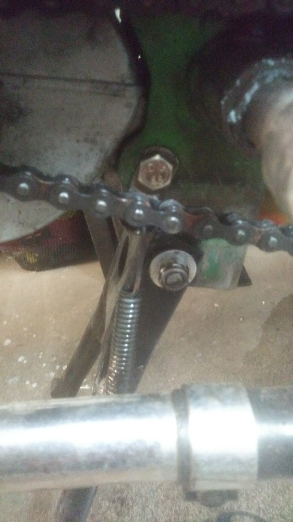 Unter deinem Ständer sind schon mal klötzchen geflickt worden. Das war oft die "erste" Lösung für das die Räder nicht auf den Boden kommen. Das packte das Problem aber am falschen Ende. Dein Ständer ist immer noch total krumm (auch in sich). Da er so krumm ist steht auch dein Vorderrad in der Luft. Normal ist der Aufstandpunkt am Boden deutlich weiter hinten das das Hinterrad frei ist!