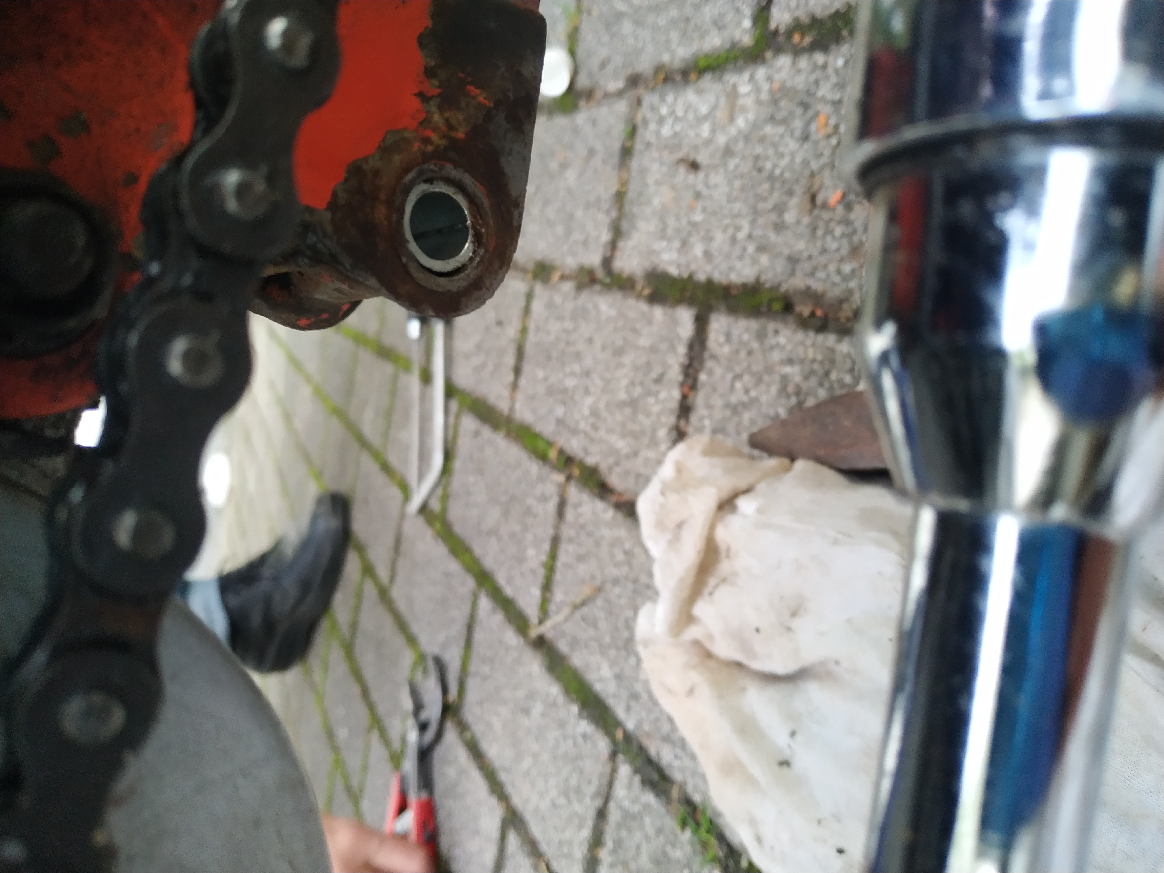 Leider haben wir letztens an "Mitch"'s M2 festgestellt das bei ihm die Buchse sich nicht mehr bewegen lies, sie war nicht aus dem Rahmen zu bekommen, und auch so hart das man sie nicht ausbohren konnte. Das wunderte mich, scheinbar war die Buchse durch das lange stehen und der bewegung der Schaube "aufgepilzt" an den Enden!? Keine Chance, nicht mit Hammerschlägen und auch nicht mit bohren die da raus zu bekommen.