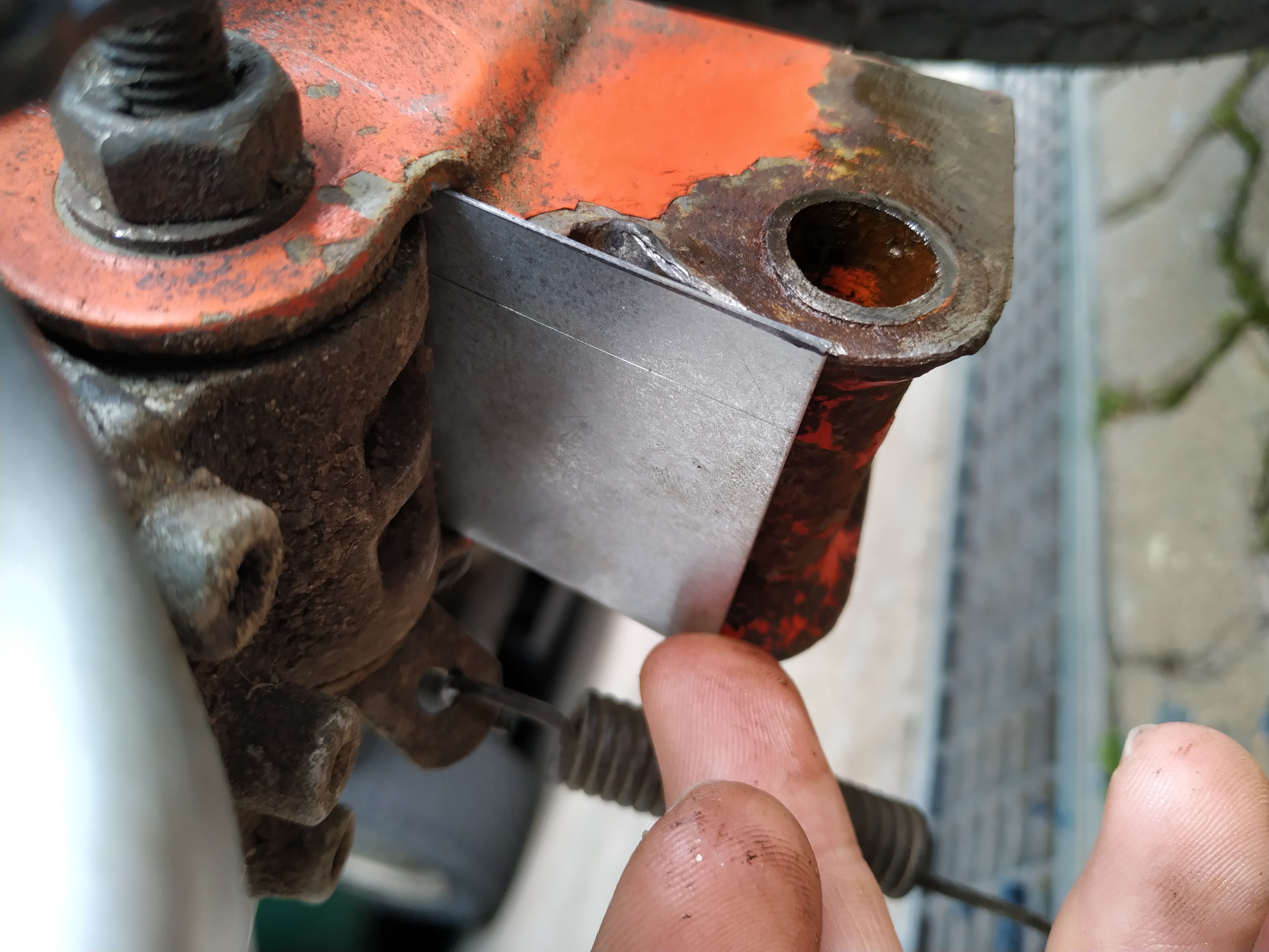 Habe mir aber dann noch gedacht, dass es schon wäre wenn das vordere Rad (wenn es auf dem Hauptständer steht) Luft zum Boden hat. Ich habe mir dann die Kontaktfläche von Hauptständer und Rahmen angeschaut und festgestellt, dass der Rahmen an einer Stelle nach ihnen verbogen ist. Deshalb habe ich mir dann zwei Bleche zurecht geschnitten, mit der Abkantmaschine. Ich habe aber das Blech nicht verschweißt, da ich das noch nicht kann. Ich habe dann einfach einen Metallkleber verwendet. Bilder hänge ich mit an.