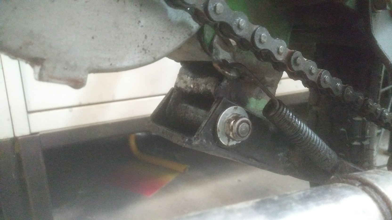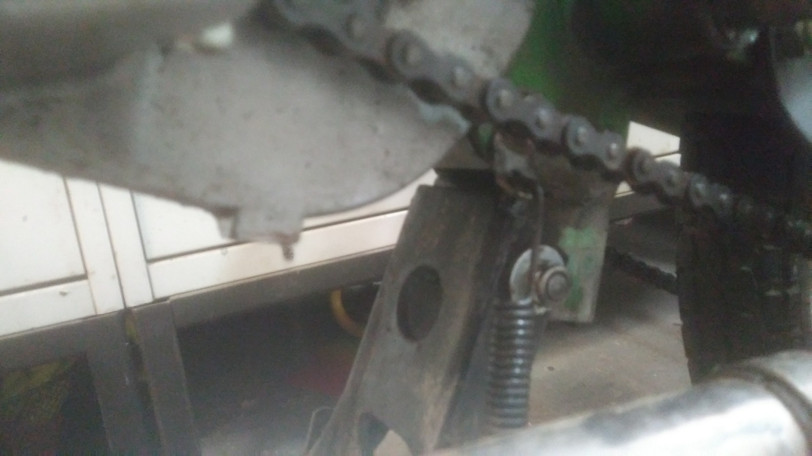 Unter deinem Ständer sind schon mal klötzchen geflickt worden. Das war oft die "erste" Lösung für das die Räder nicht auf den Boden kommen. Das packte das Problem aber am falschen Ende. Dein Ständer ist immer noch total krumm (auch in sich). Da er so krumm ist steht auch dein Vorderrad in der Luft. Normal ist der Aufstandpunkt am Boden deutlich weiter hinten das das Hinterrad frei ist!