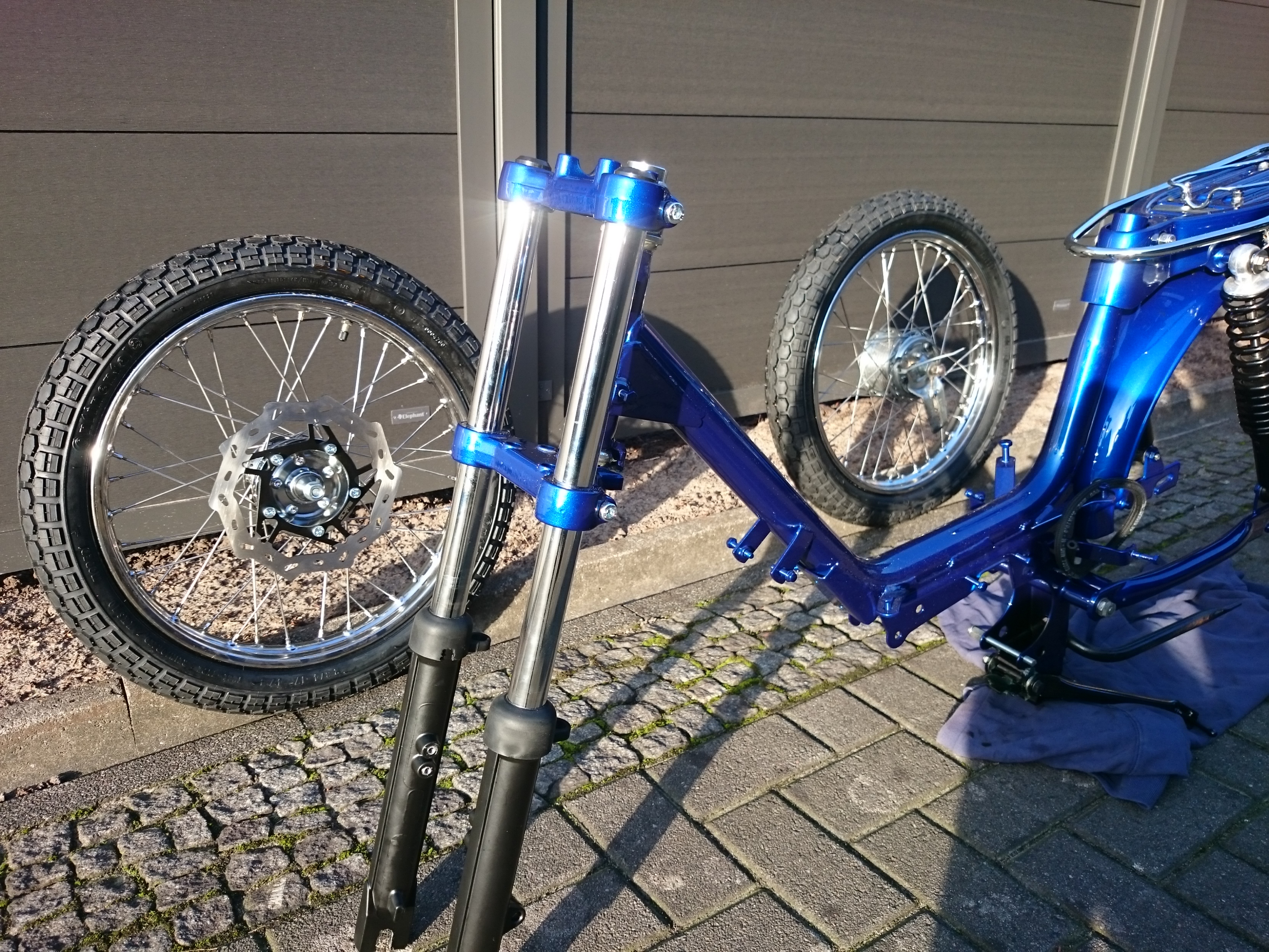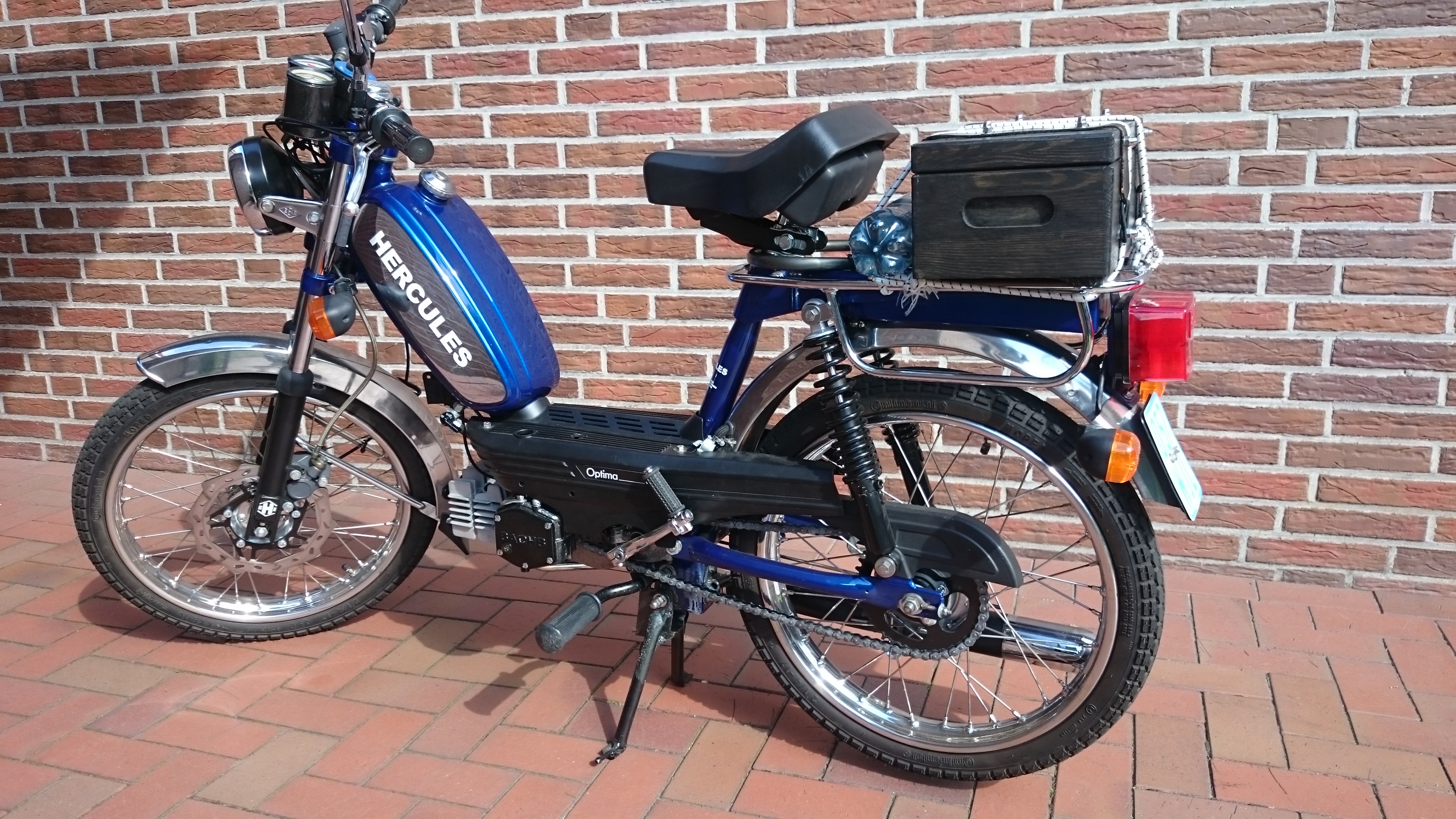 Nach längeren Bergabfahrten wurden die Trommeln so heiß, das selbst das Wasser zur Kühlung nicht viel brachte. An der Tachomitnehmer Seite kam sogar schon das Lagerfett in flüssiger Form heraus. Also gab es nur 2 Möglichkeiten. Lange Pausen (und den Anderen beim Weiterfahren zu winken) oder aber die Bremsleistung erhöhen. Beim Warten viel mir eine Puch Maxi auf, die am Vorderrad mit Bremsscheibe unterwegs war. Das muste ich auch haben. Nach dem ÖMM wurde das Web durchforstet. Leider mit der Erkenntniss : Für Puch Ja, Für Hercules Nein. Also Umbauen. Fast alle Teile gab es in der Schweiz. Doch die Preise und dann noch Zoll machten keinen Sinn. Also nach und nach alles in Österreich und Deutschland erworben. Zu erst habe ich eine Hydraulische Puch EBR Gabel mit Bremssattelbefestigung bestellt. Es folgte eine Radnabe für Speichenräder mit Bremscheibenaufnahme. Dann die Bremspumpe mit Kolbenzange und für die Gabel noch eine neue Untere Gabelbrücke für Hercules. Nun nur noch montieren. Hört sich einfacher an als es ist, aber mit ein wenig Zeit kein Problem. Das Moped bekam noch einen Zusatztank, unauffällig unter dem Gepäckträger. Mit zusätzlichen 1,8 Litern und dem 3Gang Kick Motor schon ein schönes Gefährt. Bei den Amaturen hatte ich noch die Idee außer dem Tacho noch eine Temperaturanzeige zu verbauen. Da Beide 6 cm Durchmesser haben , habe ich mir ein Edelstahlrohr für Auspuffanlagen genommen und daraus ein Cockpit gebaut. So... Bremsleistung ist jetzt super, nur der ÖMM fehlt noch.