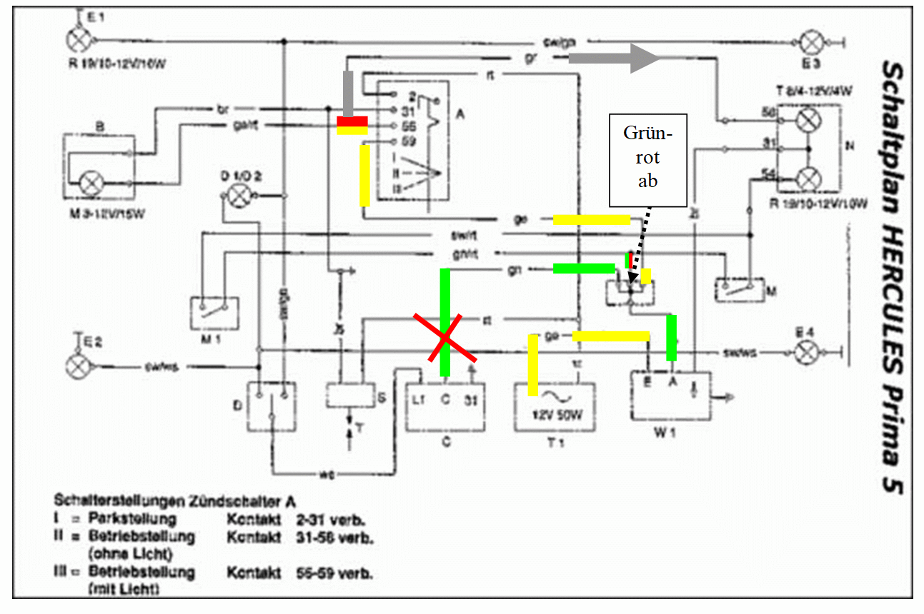 das gelb im stromkreis kann auch grün sein...dann wird gelb aus der zündung direkt an regler gehn und kommt dann da als grün wieder raus...dann hängen alle anderen verbraucher halt mit an grün ...das zum zündschloss geht..