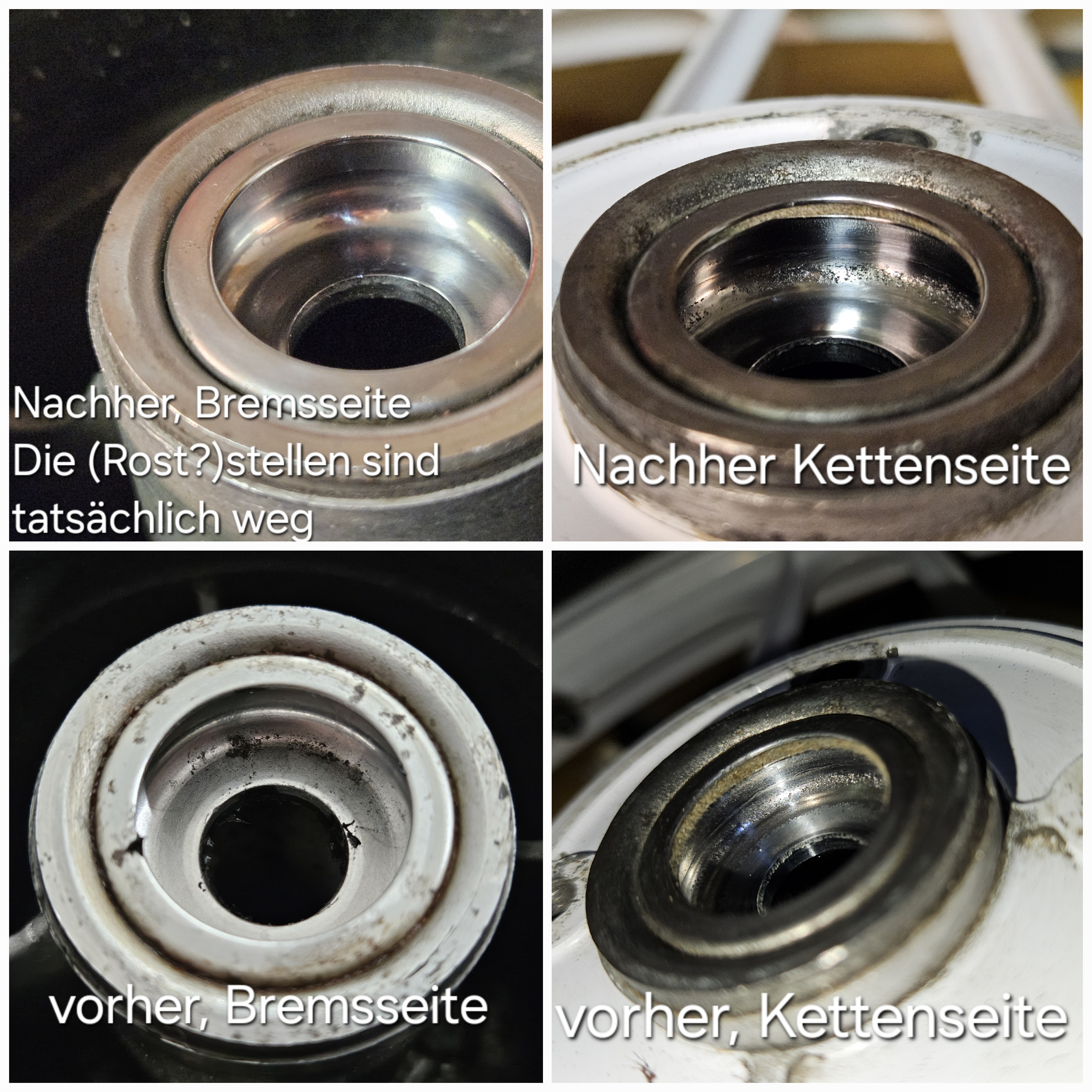 Also Polieren an sich hat ganz ok funtioniert, habs mit nem Dremel und der Politur gemacht, also die allgemeine Rauheit (?) Ist ganz ok geworden, aber die Kettenradseite war schon schlimmer, also das hat das natürlich nicht wegschleifen können, aber zu viel darf ja auch eh nicht weg.