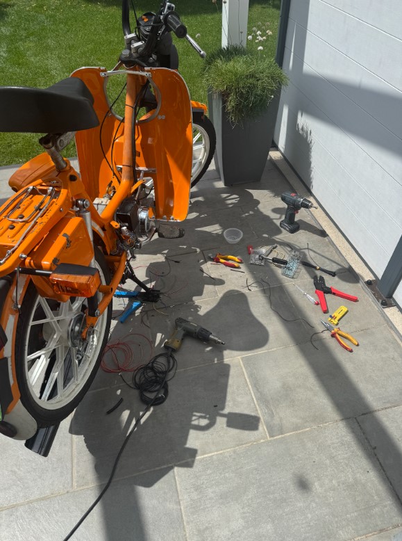 Gestern ging es an die Elektrik. Der Vorgänger hat alles rausgerissen. Nur Schwarz und gelb zum Zündschloss, das war alles was vom Kabelbaum übrig war. Rücklicht war mit einem Feuchtraumkabel angeschlossen. Aber nix was man nicht reparieren kann.