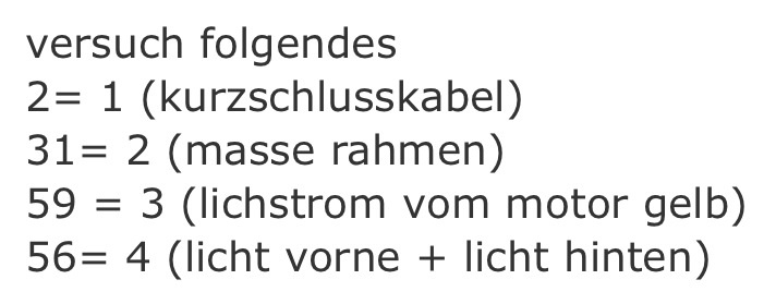 nun muss nur noch mein Elektrik Problem gelöst werden , da hab ich glaubig etwas falsch verkabelt sicherlich ab Zündschloss da dieses nicht an geklemmt war und die Kabel wegen eines Defekten Scheinwerfers nur gesteckt waren. Aber wie ?