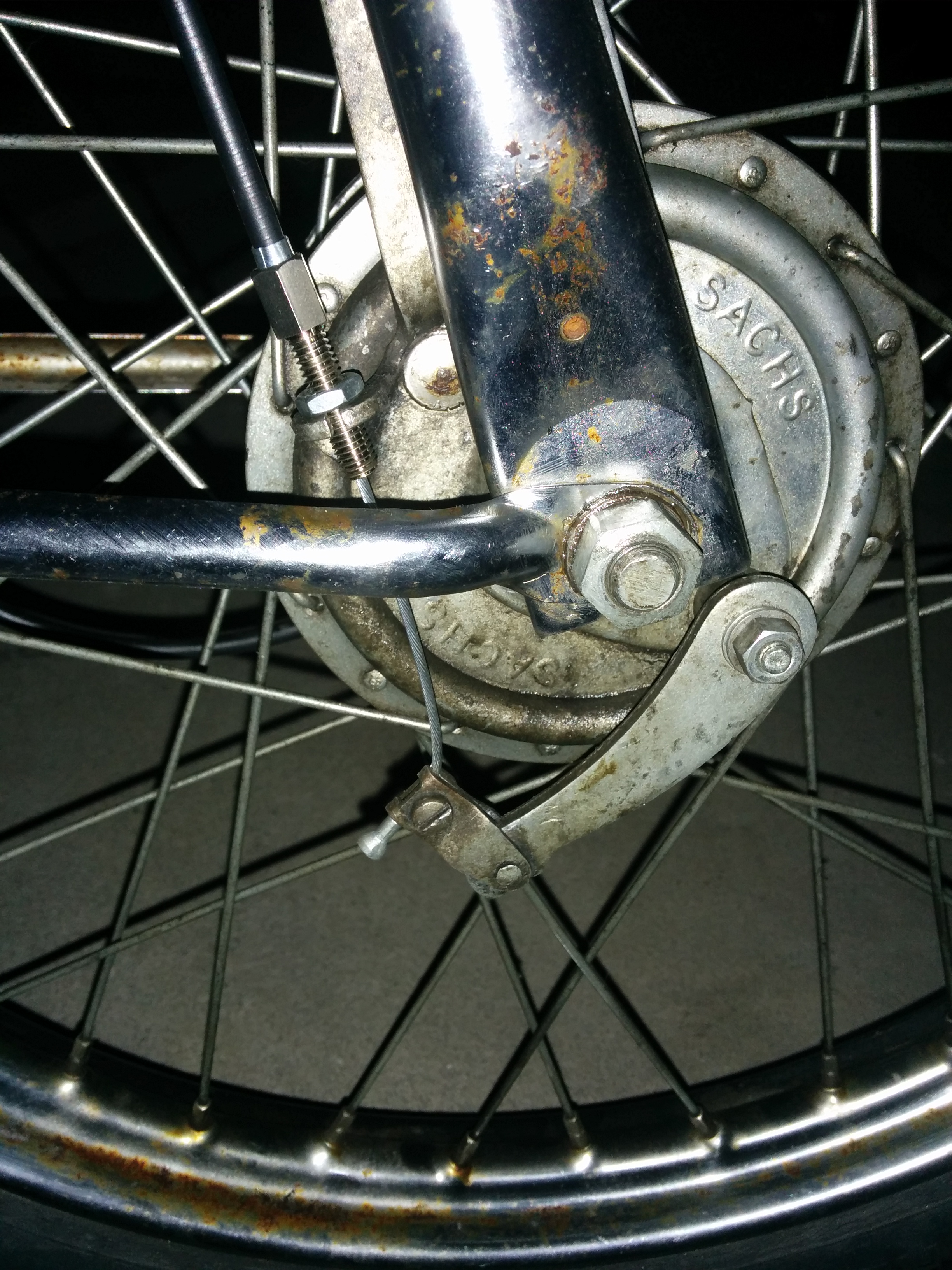 an meiner MP4 ist ebenfalls so ein Bremsenteller bzw. Bowdenzugbefestigung vorgesehnen. Hier wird der Zug (ohne Nippel) durch eine einfache Klemmbefestigung fixiert. Übrigens bei meinem Moped hält diese Variante trotzdem recht gut!
