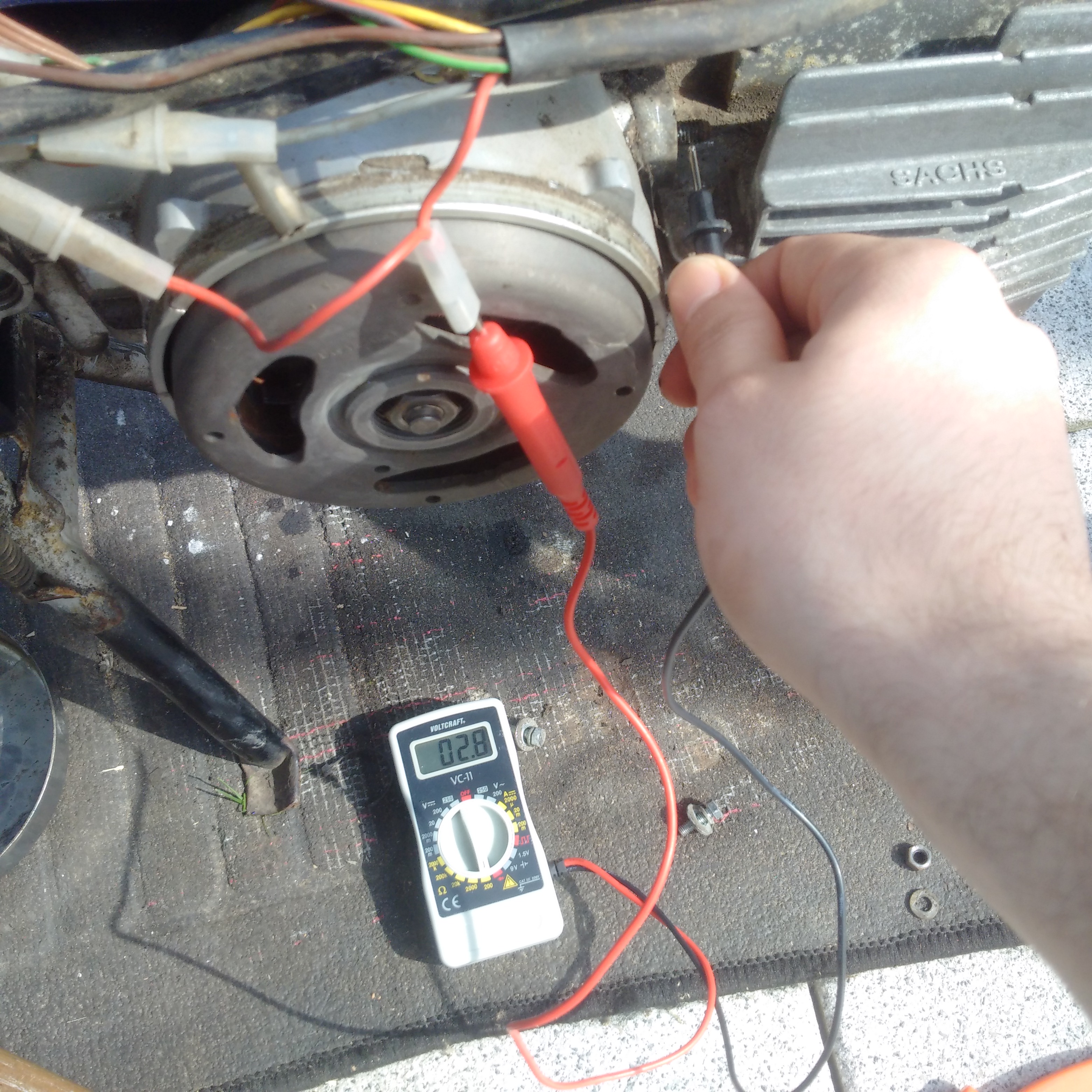 Relativ schnell stellte ich fest, dass ich keinen Zündfunke bekomme. Zündkerze und Zündkerzenstecker habe ich schon getauscht, nichts passiert. Daher wollte ich mich heute mit dem Multimeter mal auf Spurensuche begeben. Zündspule ausgebaut und Spannung gemessen.